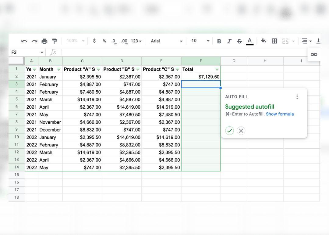 The next time you need to enter a series of dates or copy a formula, enter the first two, then stop. Use the Ctrl + D key combination, or Command + D if you’re using a Mac, to fill a column down. Google Sheets will guess and fill in the rest of the dates or other figures based on the patterns it recognizes in your row or column. You can also use Ctrl + R or Command + R to fill a column to the right. This is also called “flash fill.”