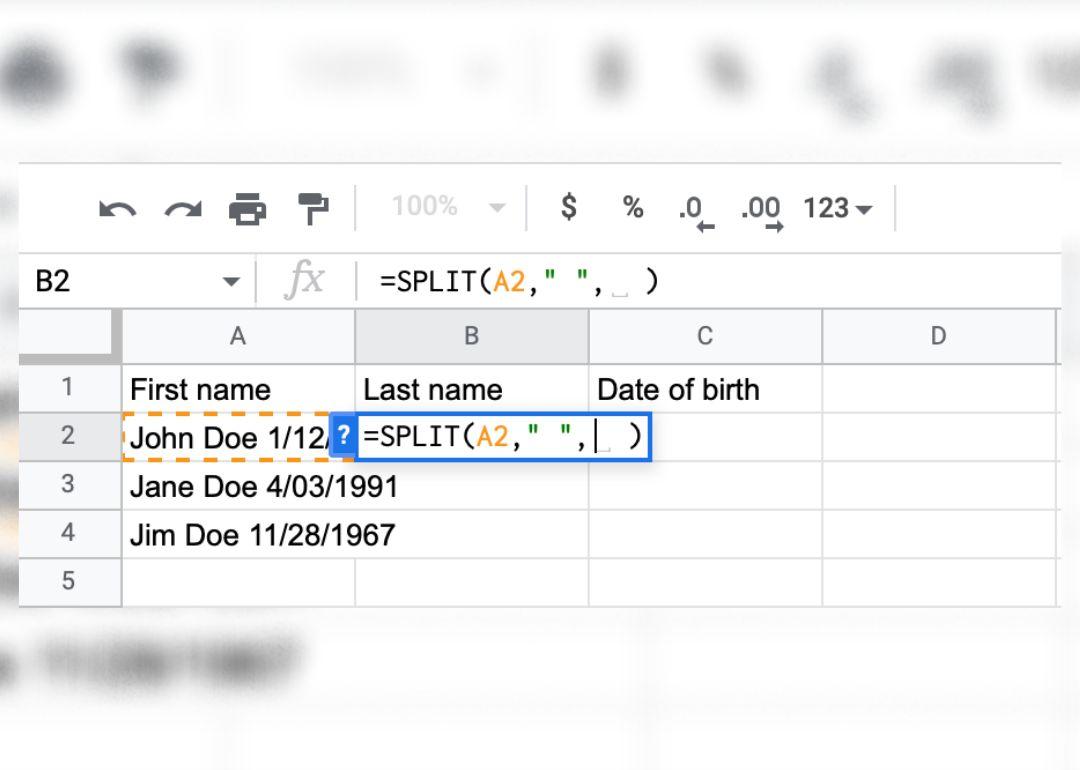 A close-up of several spreadsheet cells including columns for first name, last name and date of birth.