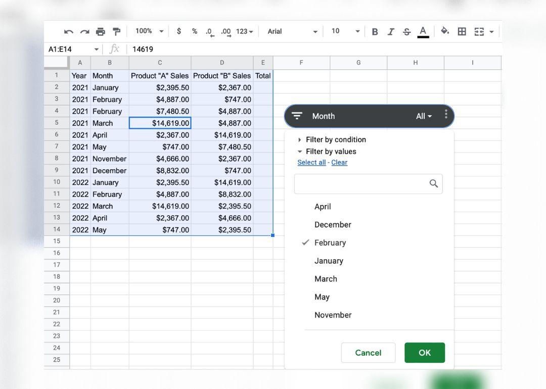 A screenshot of a spreadsheet with the data table highlighted and a so-called “slicer” button to the right of it. The slicer has a drop down list and the month of February is selected.