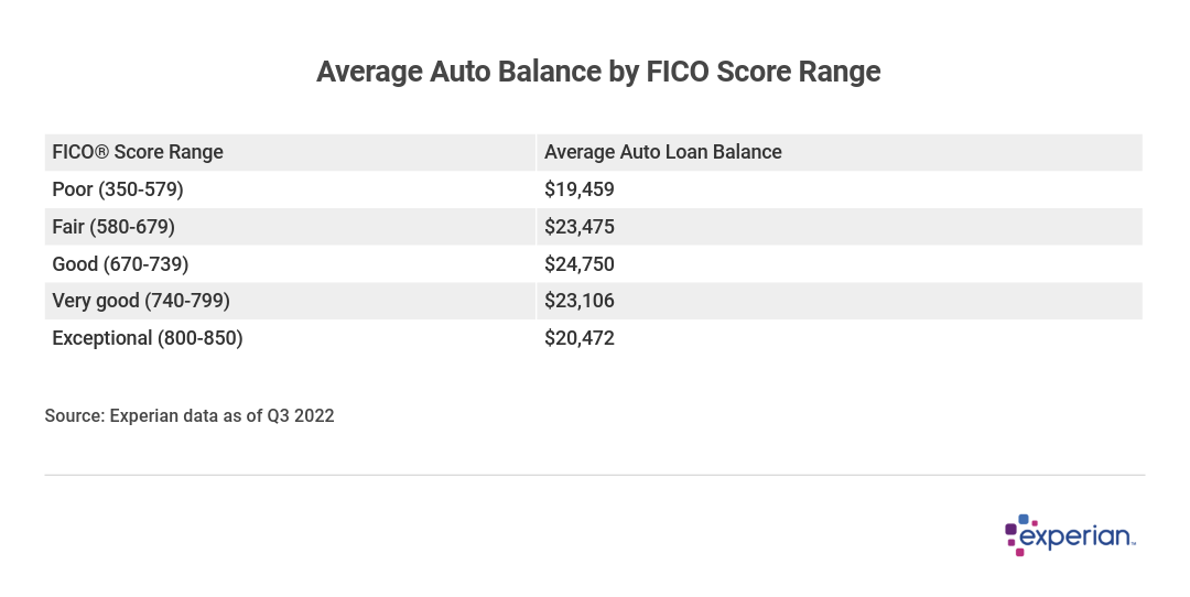 A chart listing the average auto loan balance held by people with different levels of credit score.