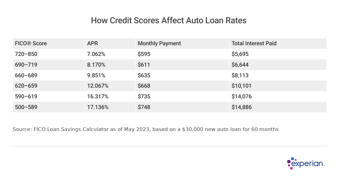 Table showing typical APRs, monthly payments, and interest paid based on FICO score.