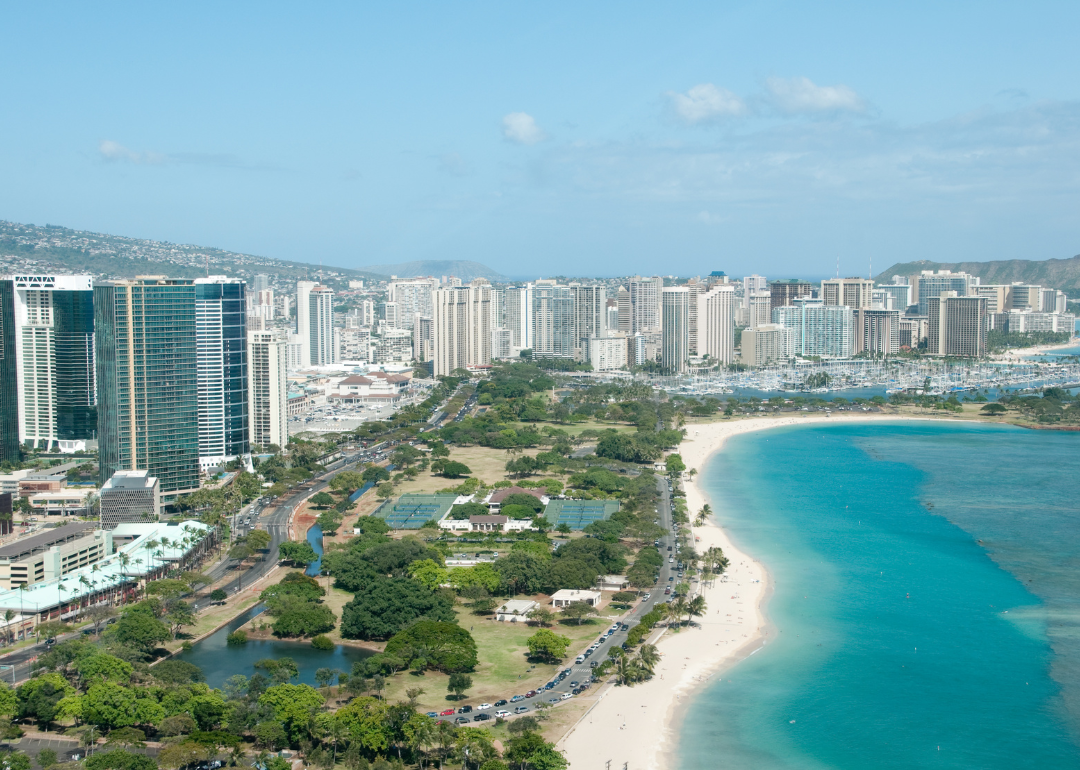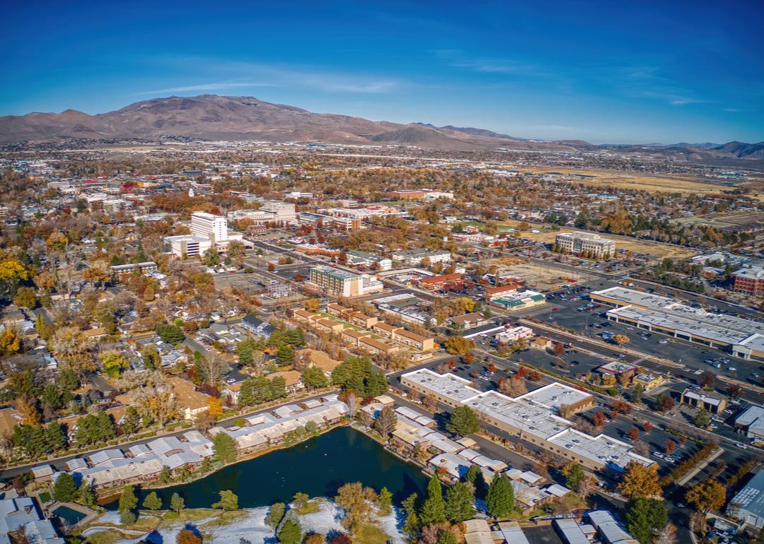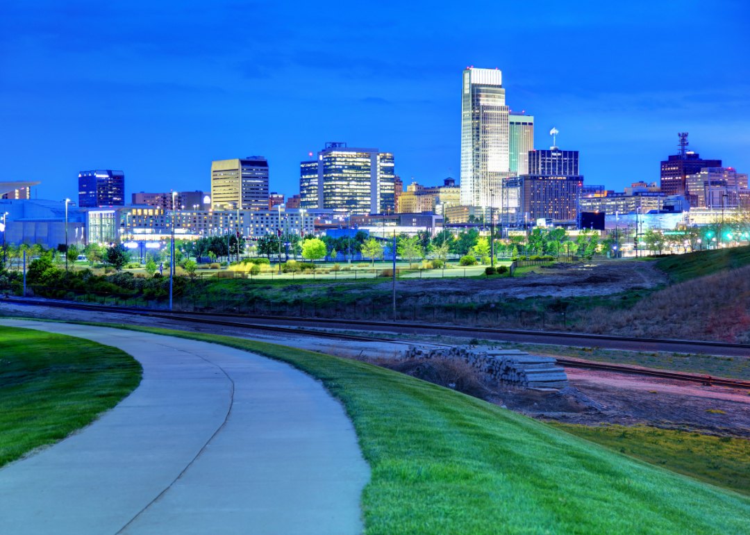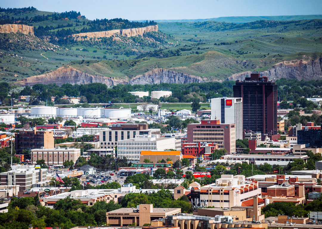 Boise, Idaho, as viewed from afar, with trees in the foreground.