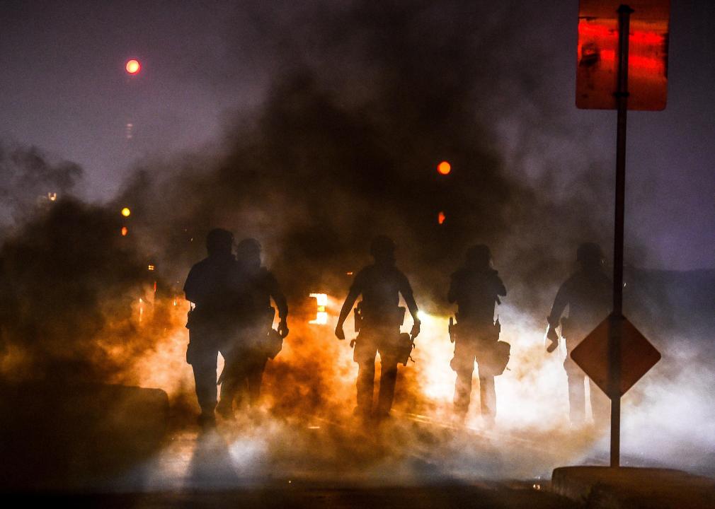 [Pictured: Protest of the shooting death of Michael Brown outside Ferguson Police Department Headquarters, Aug. 11, 2014, in Ferguson, Missouri.]