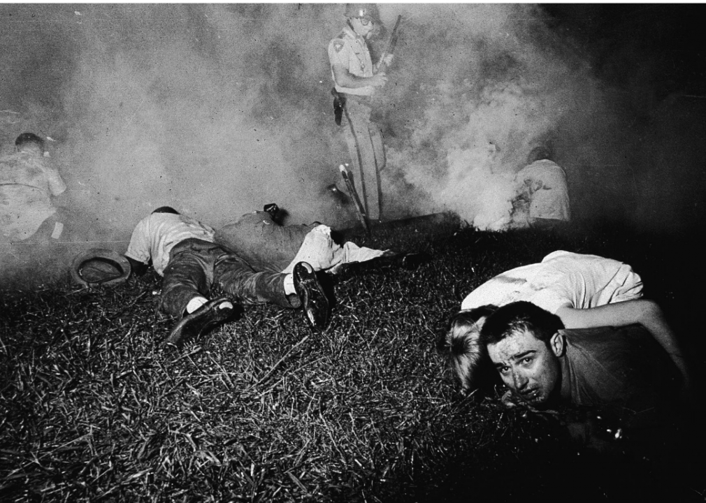 [Pictured: Civil rights marchers stay close to the ground as Mississippi Highway Patrolmen use tear gas on the protestors, Canton, Mississippi, 1960s.]