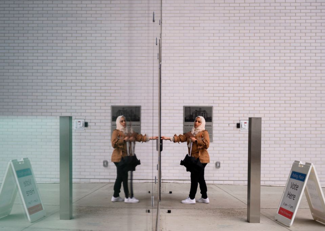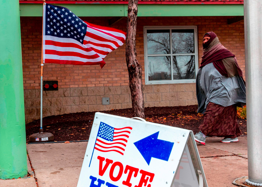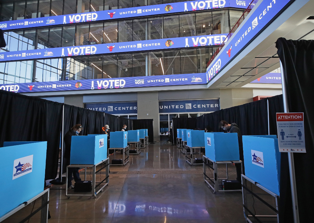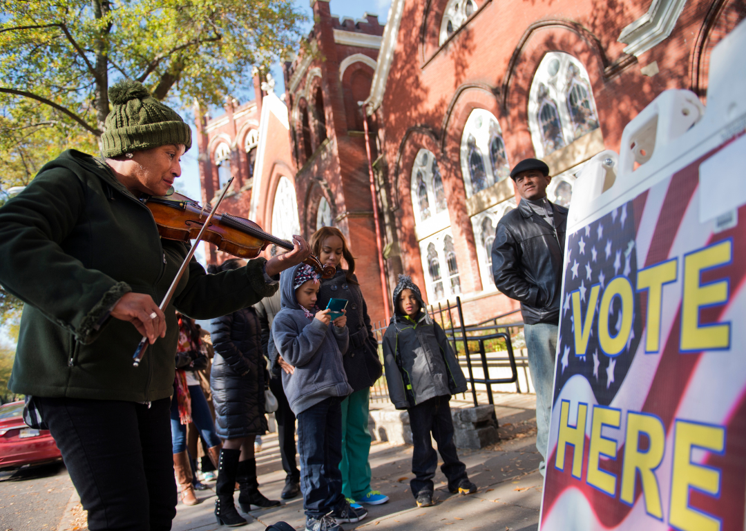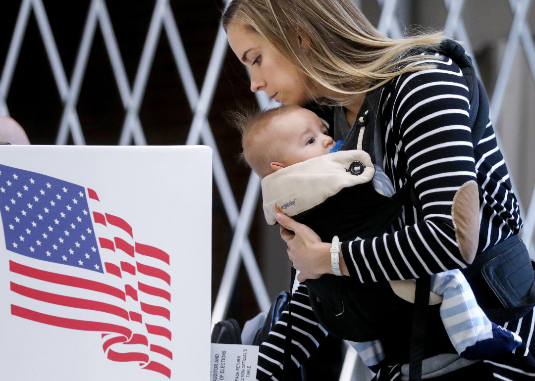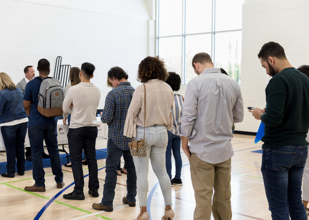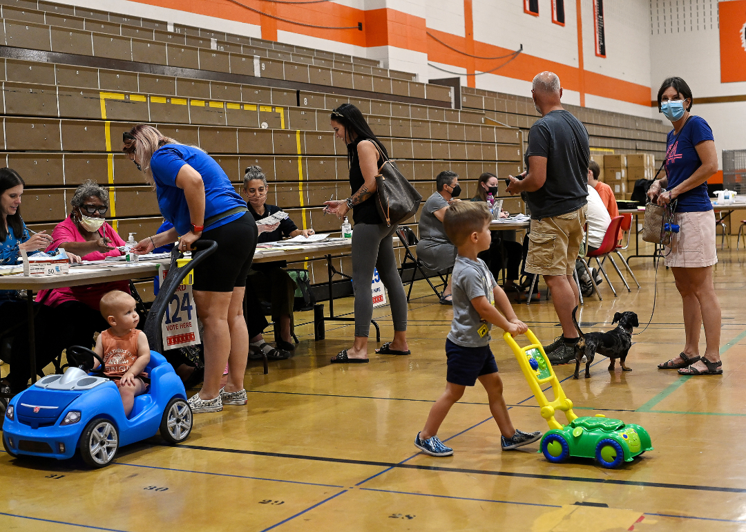 Voters, children, and pets waiting in line inside a polling station in Milwaukee, Wisconsin