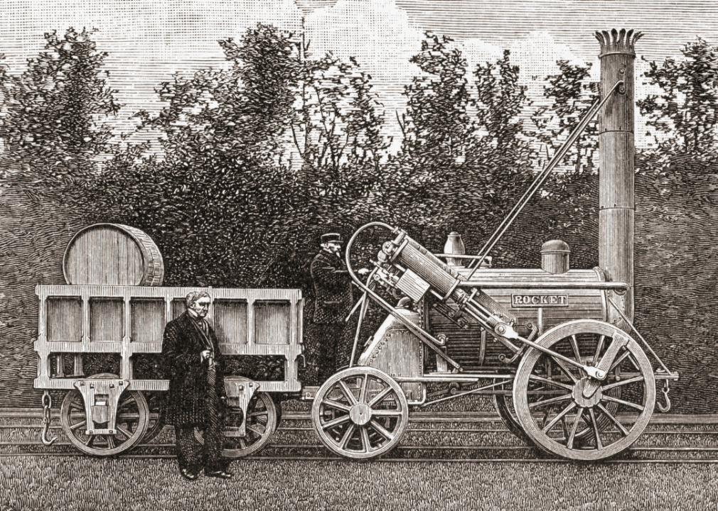 In 1825, the first steam locomotive transported 450 people 25 miles between the two towns of Darlington and Stockton, England, at 15 miles per hour. The engine would have enormous implications for the future of travel. Once the power of steam engines became obvious, plans for horse-drawn railways were scrapped. In their place, railways that could transport heavy goods like coal—not to mention people—sprang up all across the world. In the United States, the railway facilitated westward expansion through the country, which led to the development of railway and mining towns throughout the American West, as people moved westward in pursuit of business opportunities and new ventures.