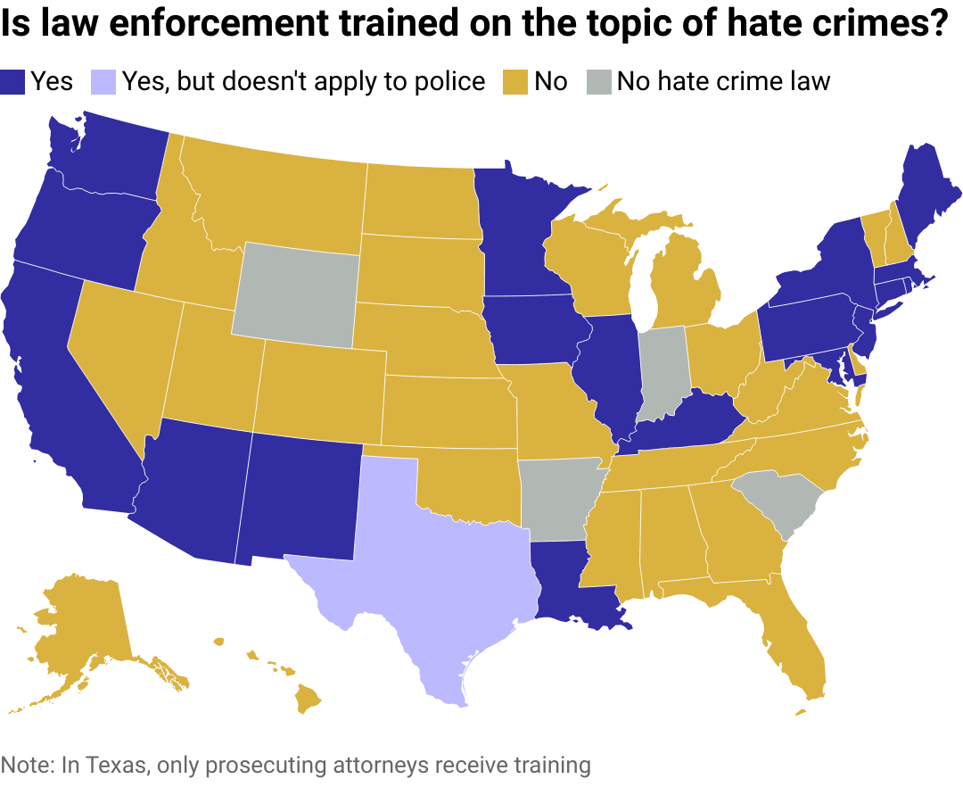 A map of the U.S. showing which states train law enforcement on the topic of hate crimes