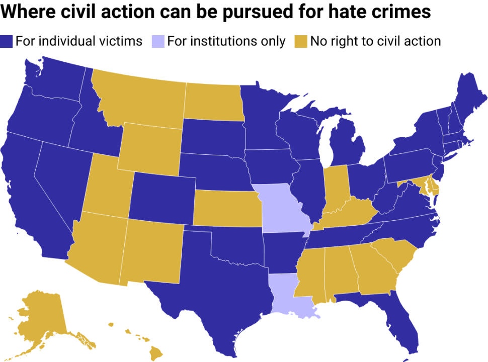 A map of the U.S. showing which states allow victims of hate crimes to pursue civil action