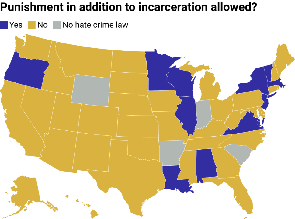 A map of the U.S. showing which states have additional consequences beyond incarceration for hate crimes