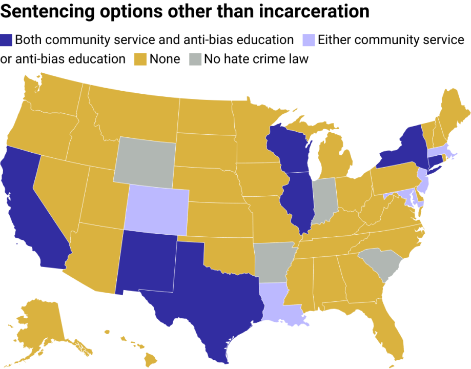 As an alternative to enhanced penalties, some states allow courts to exercise their discretion in choosing from available sentencing options. A few states’ hate crime laws explicitly allow courts to recommend or require those convicted of hate crimes to complete community service or anti-bias education instead of or in addition to a prison sentence.