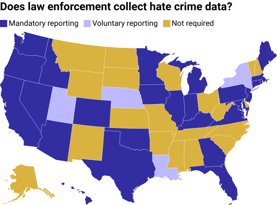 A map of the U.S. showing which states require law enforcement to collect and report data on hate crimes