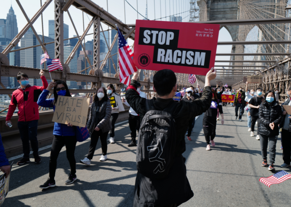 Demonstrators march across Brooklyn Bridge at Stop Asian Hate rally