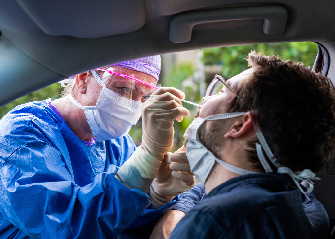 A doctor in a protective suit taking a nasal swab from a person to test for a possible coronavirus infection