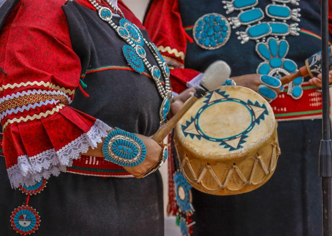 Member of Zuni tribe plays drum in ceremony in Gallup, New Mexico.