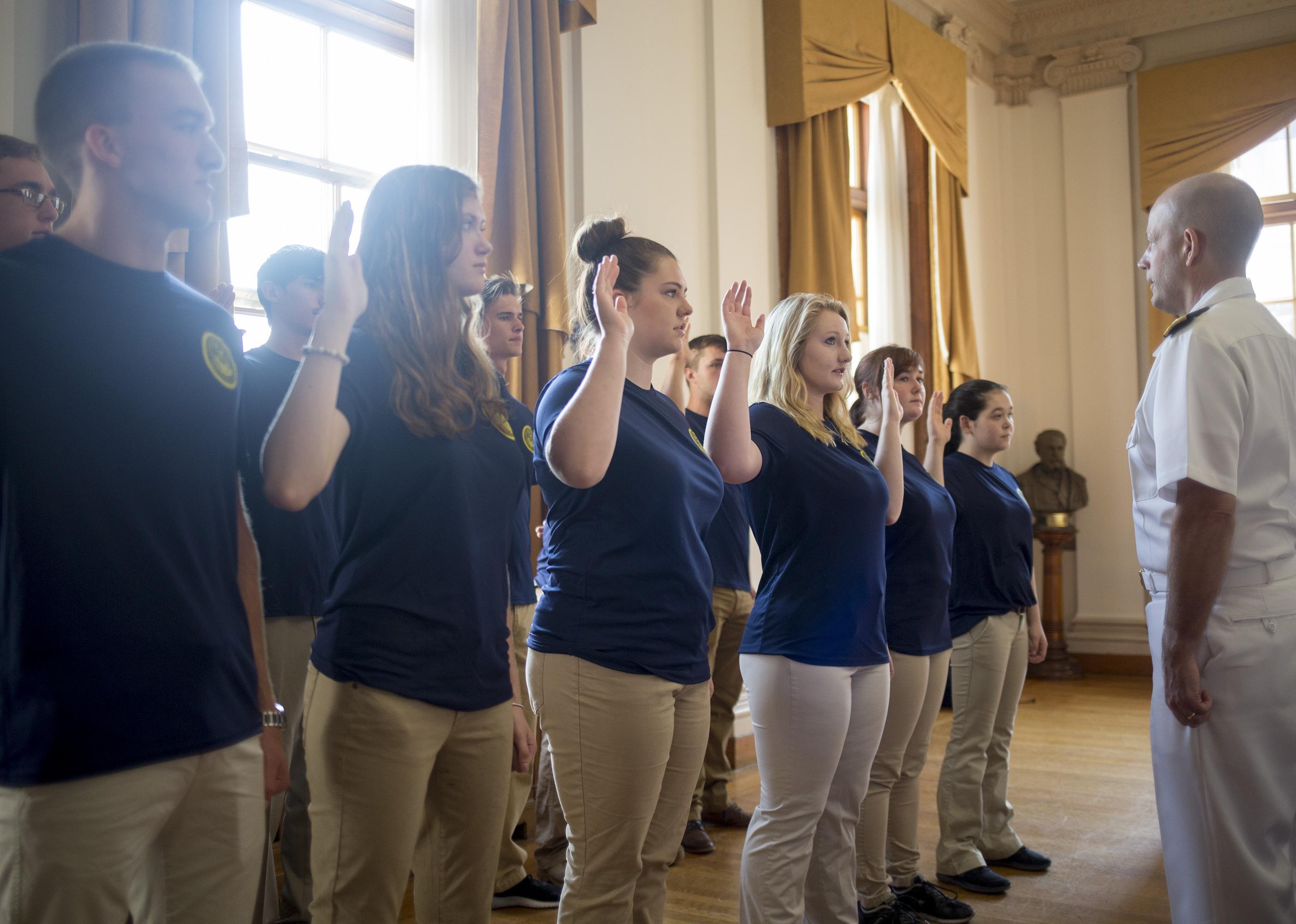 New Navy sailors in blue shirts and khaki pants are sworn in by a sailor in white.