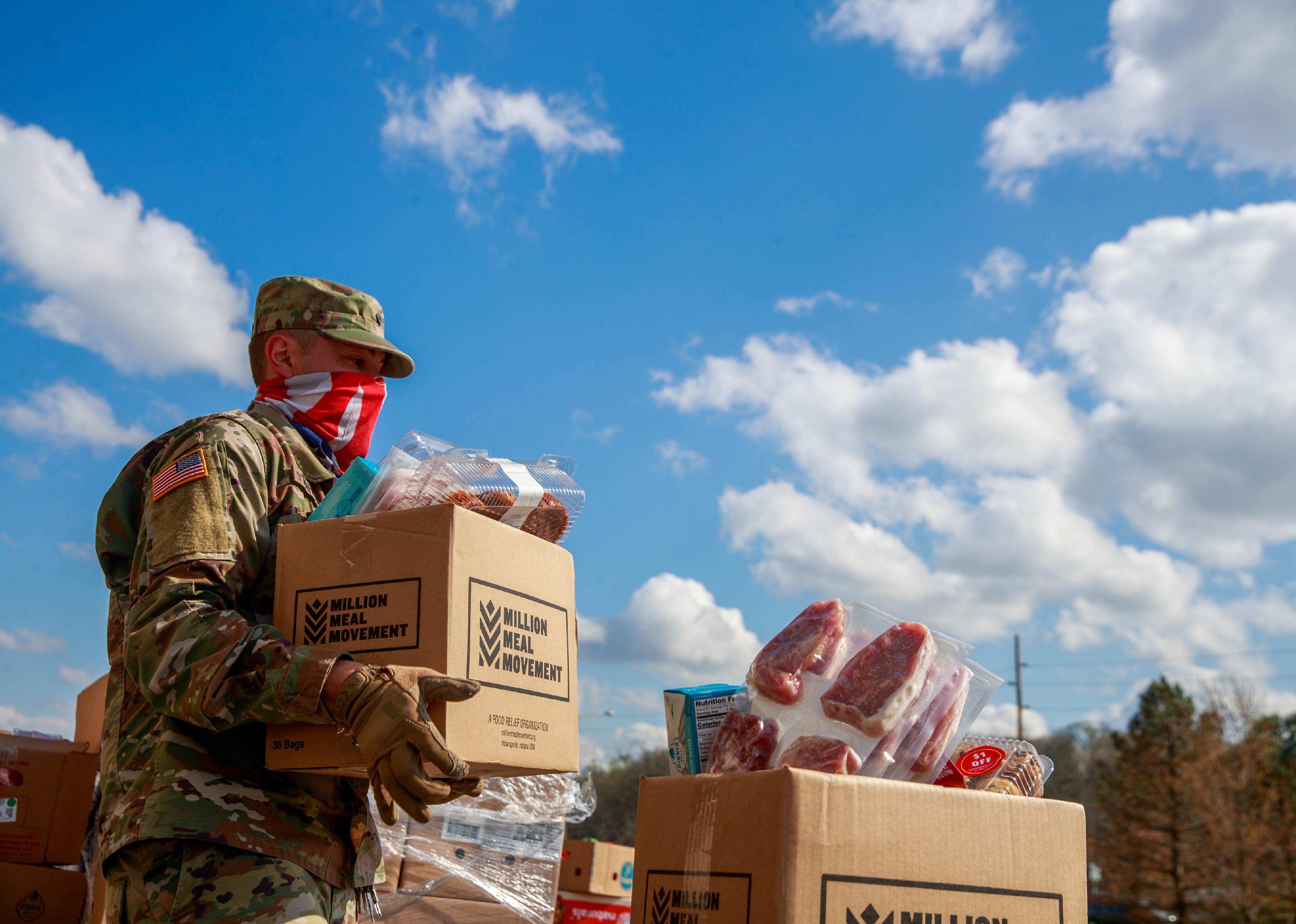 A member of the Indiana National Guard wearing an American flag balaclava carries a box of food while helping workers in distributing food.