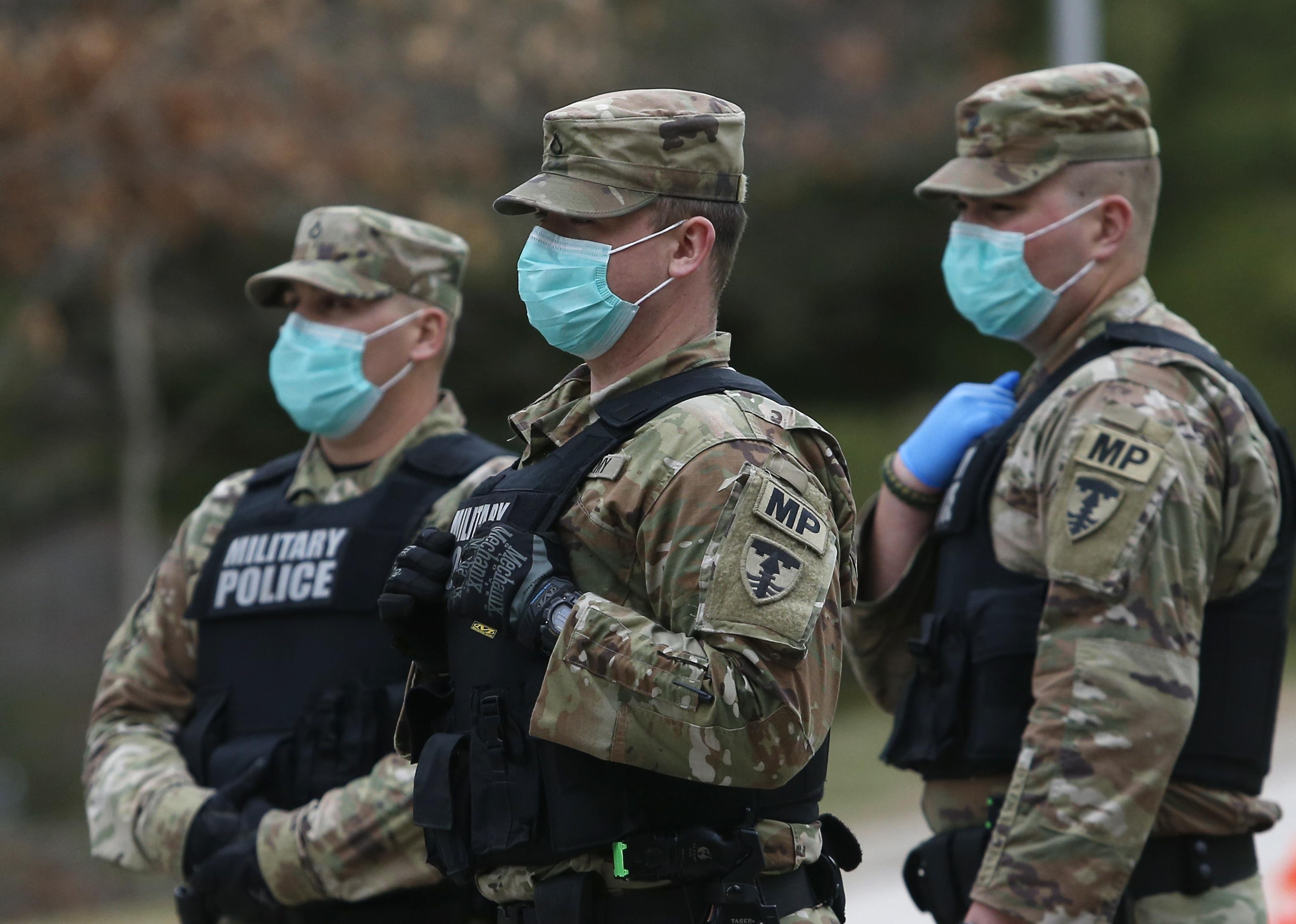 Military police wearing masks and gloves waiting at a checkpoint.