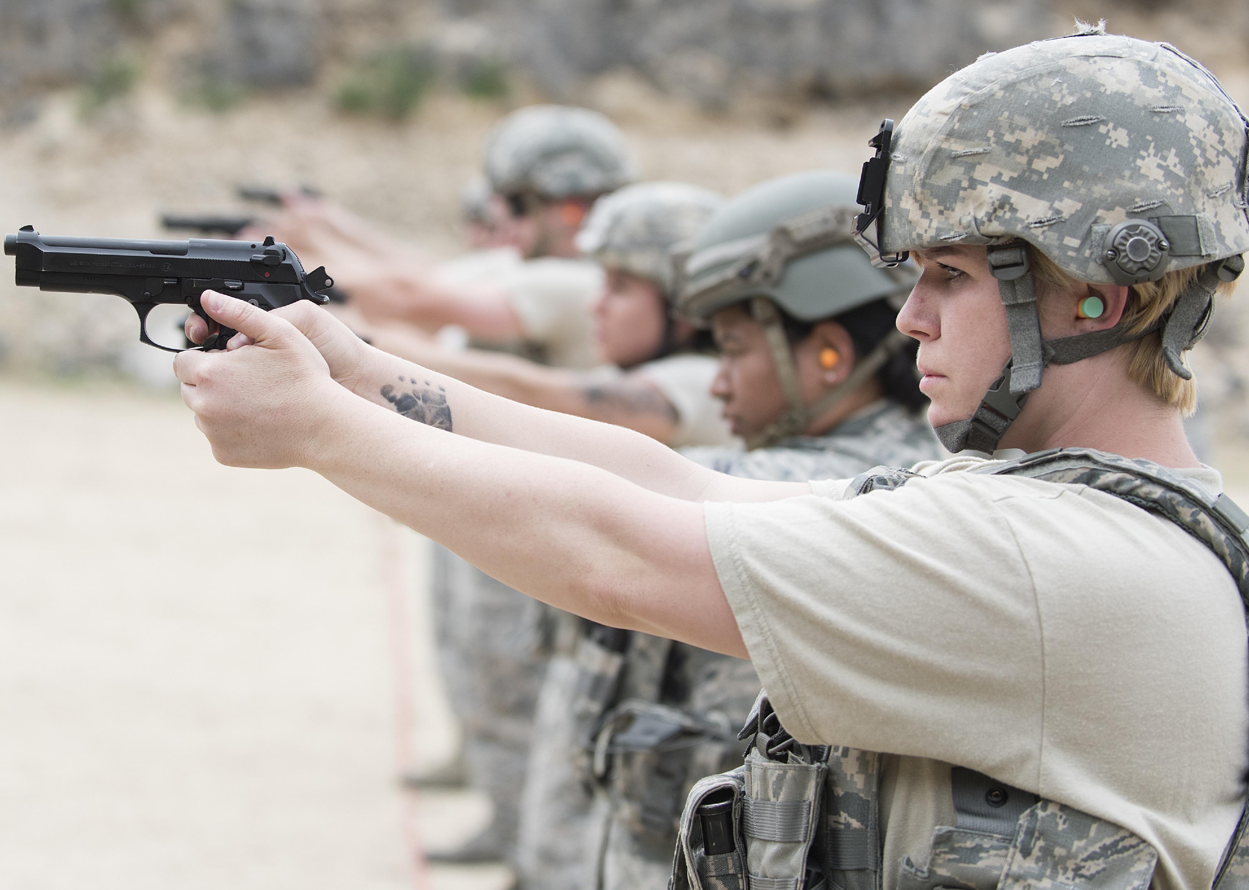 A line of women in camouflage and helmets aiming guns.