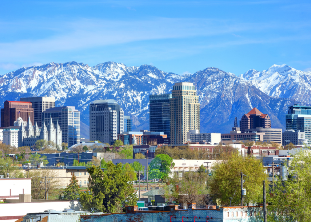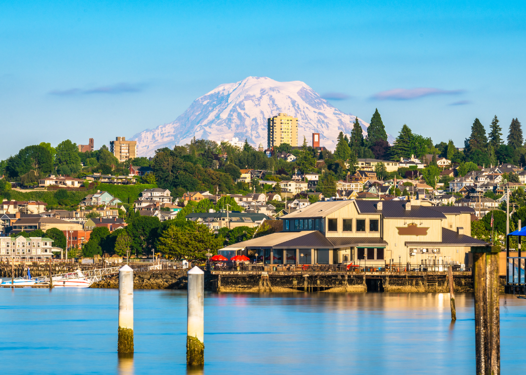 Homes and businesses on a hill in Tacoma with mountains in the background.