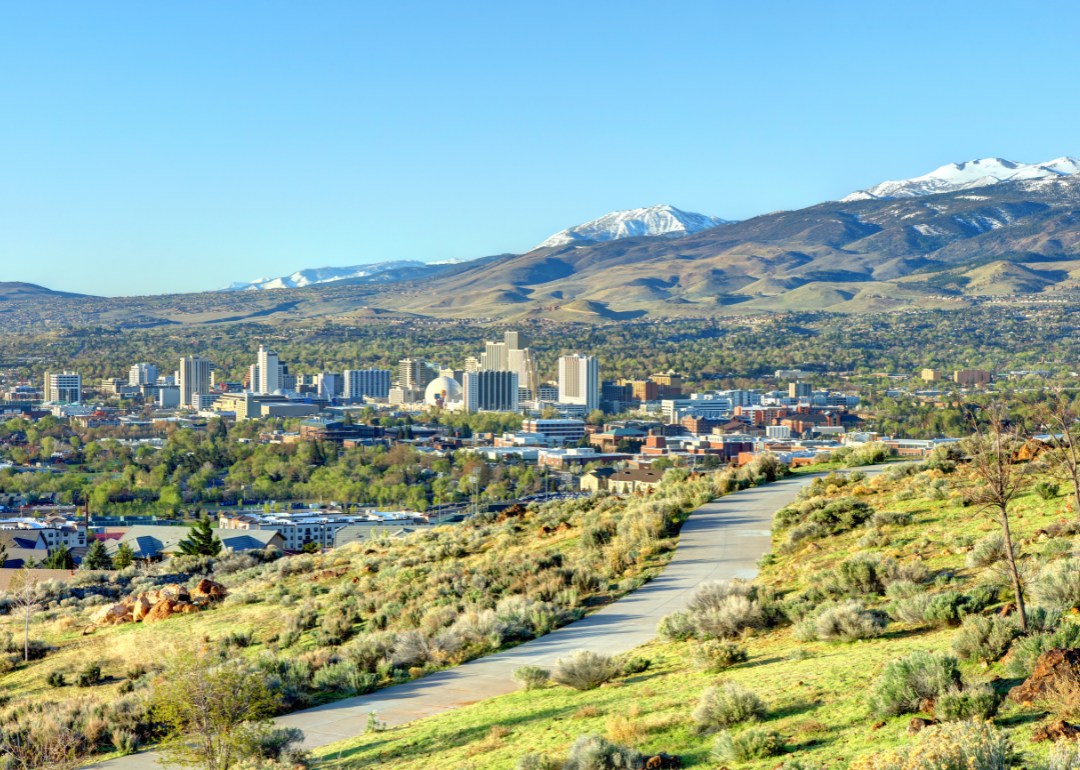 An aerial view of Casper with mountains in the background.