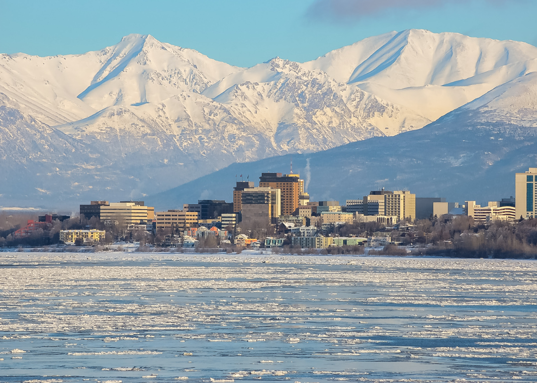 The Anchorage waterfront and skyline with snow-covered mountains in the background.