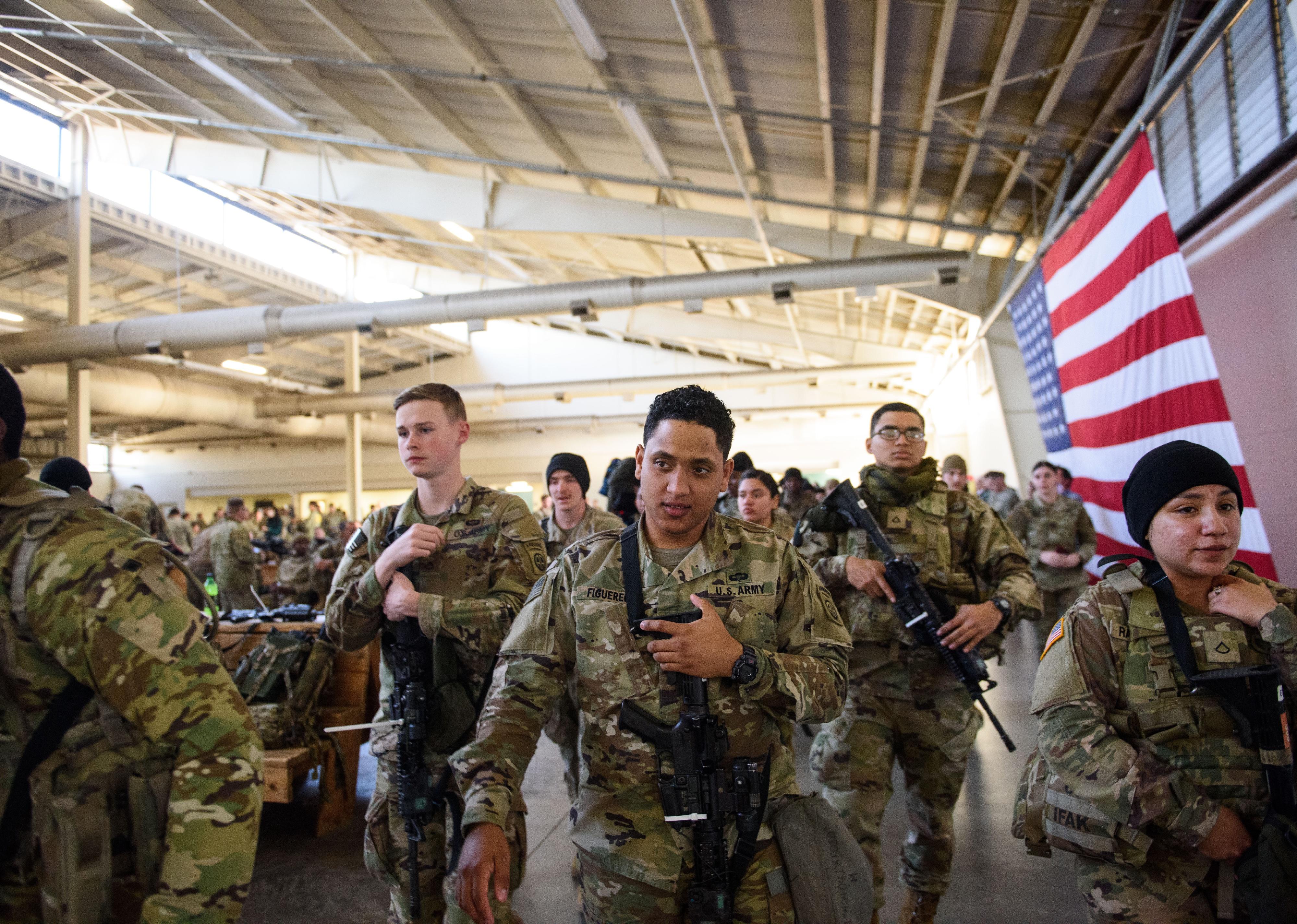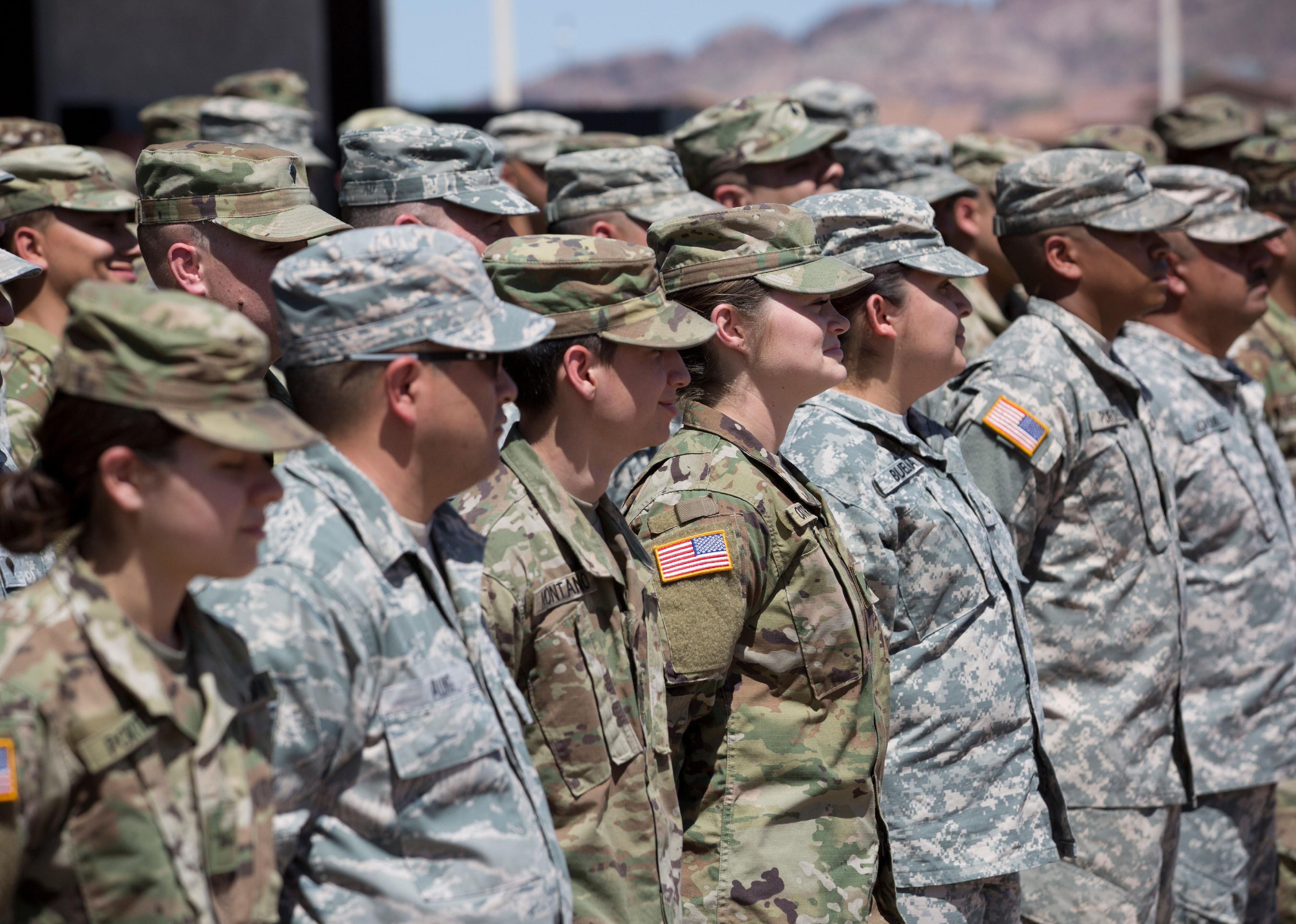 A line of active duty Army soldiers in camouflage.