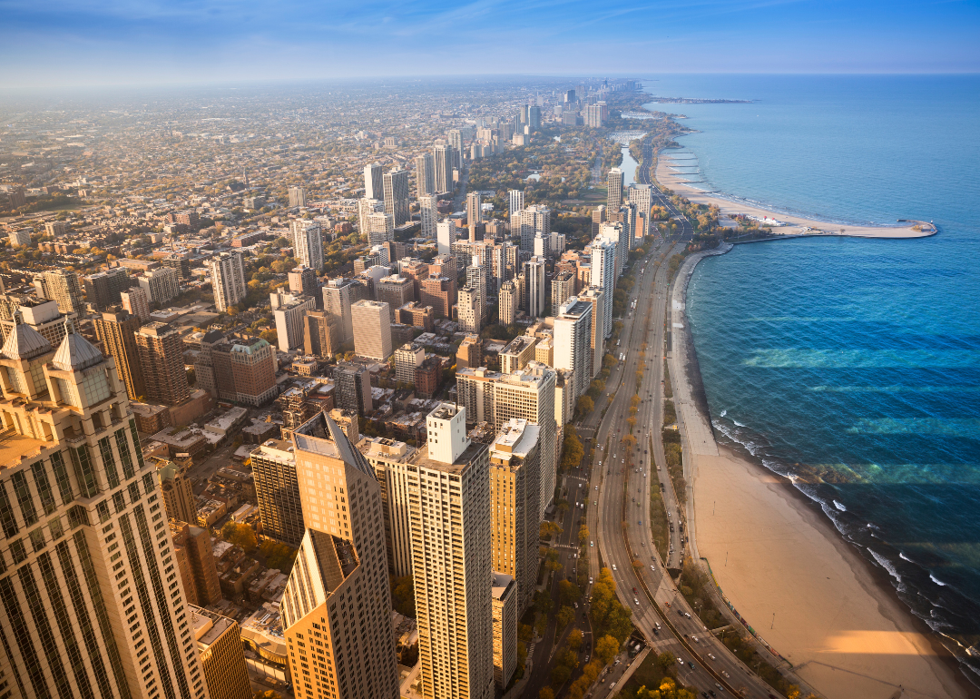 An aerial view of downtown Chicago on the water.