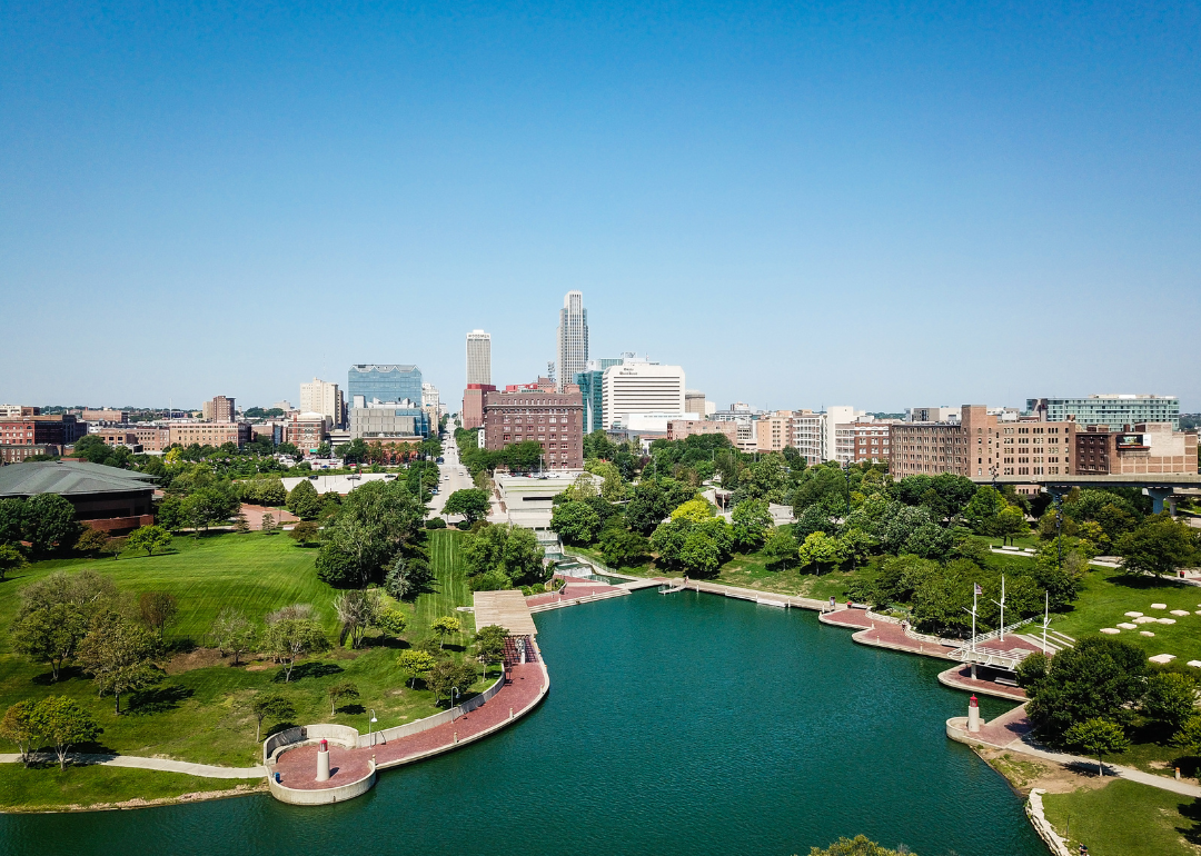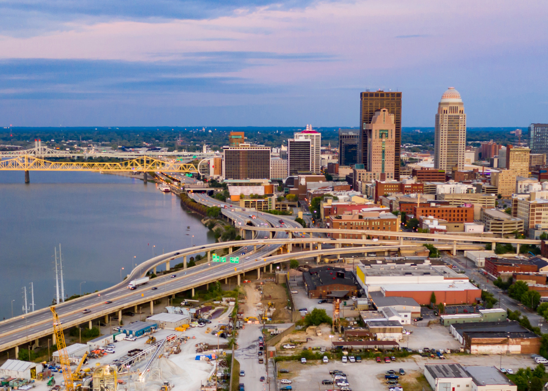 An aerial view of downtown Louisville on the water.