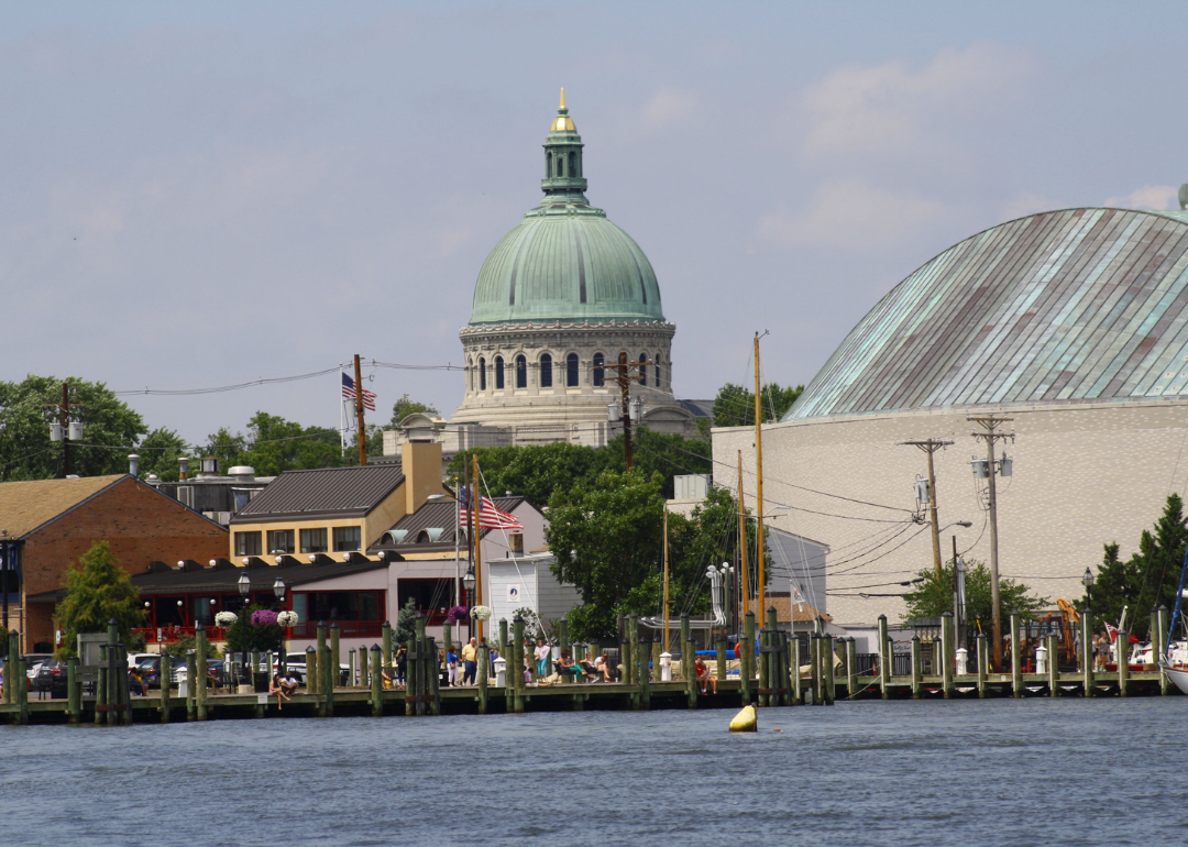 A historic building with a green dome and businesses on the water at the Naval Academy in Annapolis.