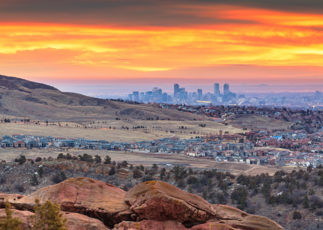 A faraway view of the skyline of Denver with homes in the foreground at sunset.