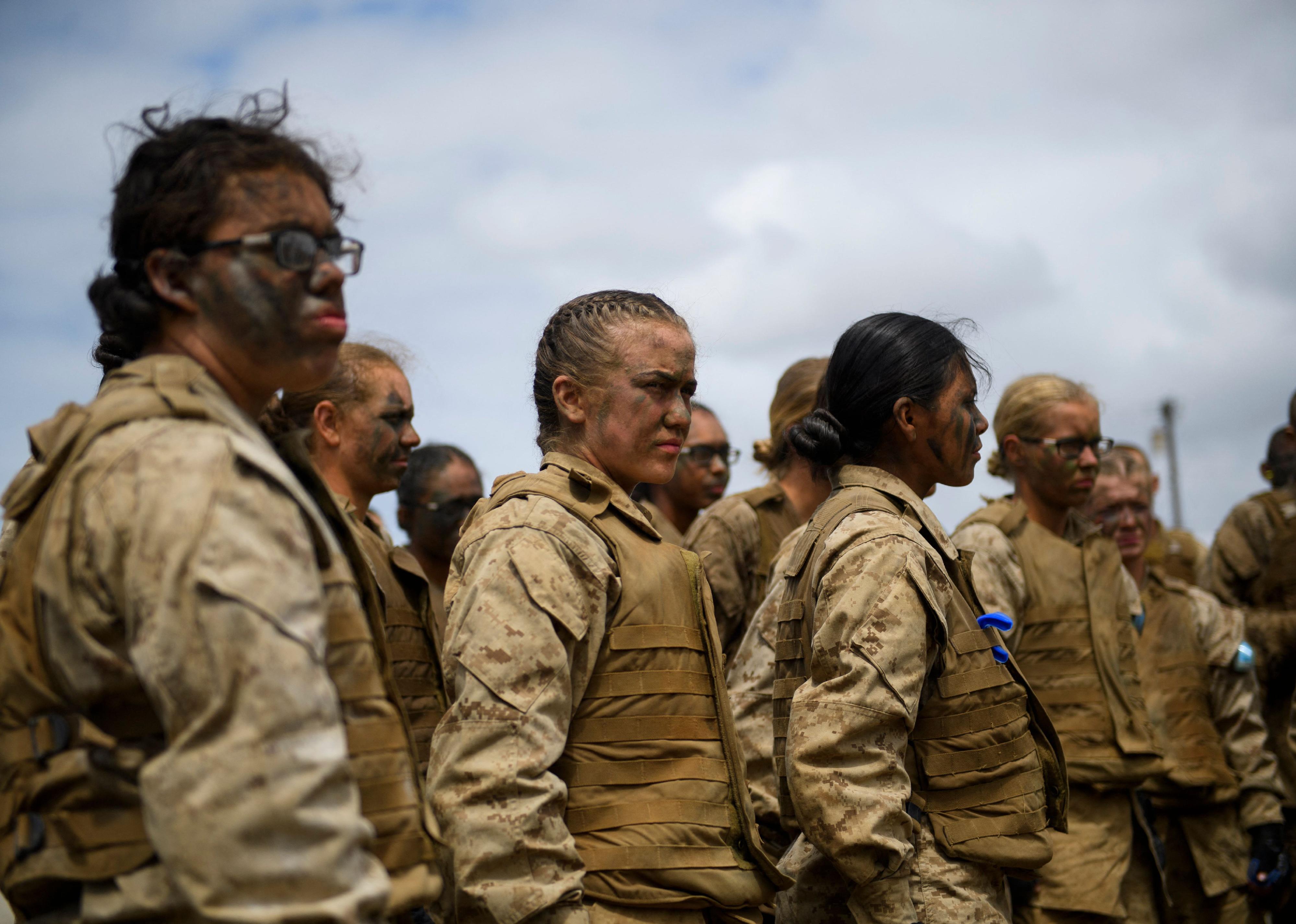 A group of women in tan camouflage military gear.