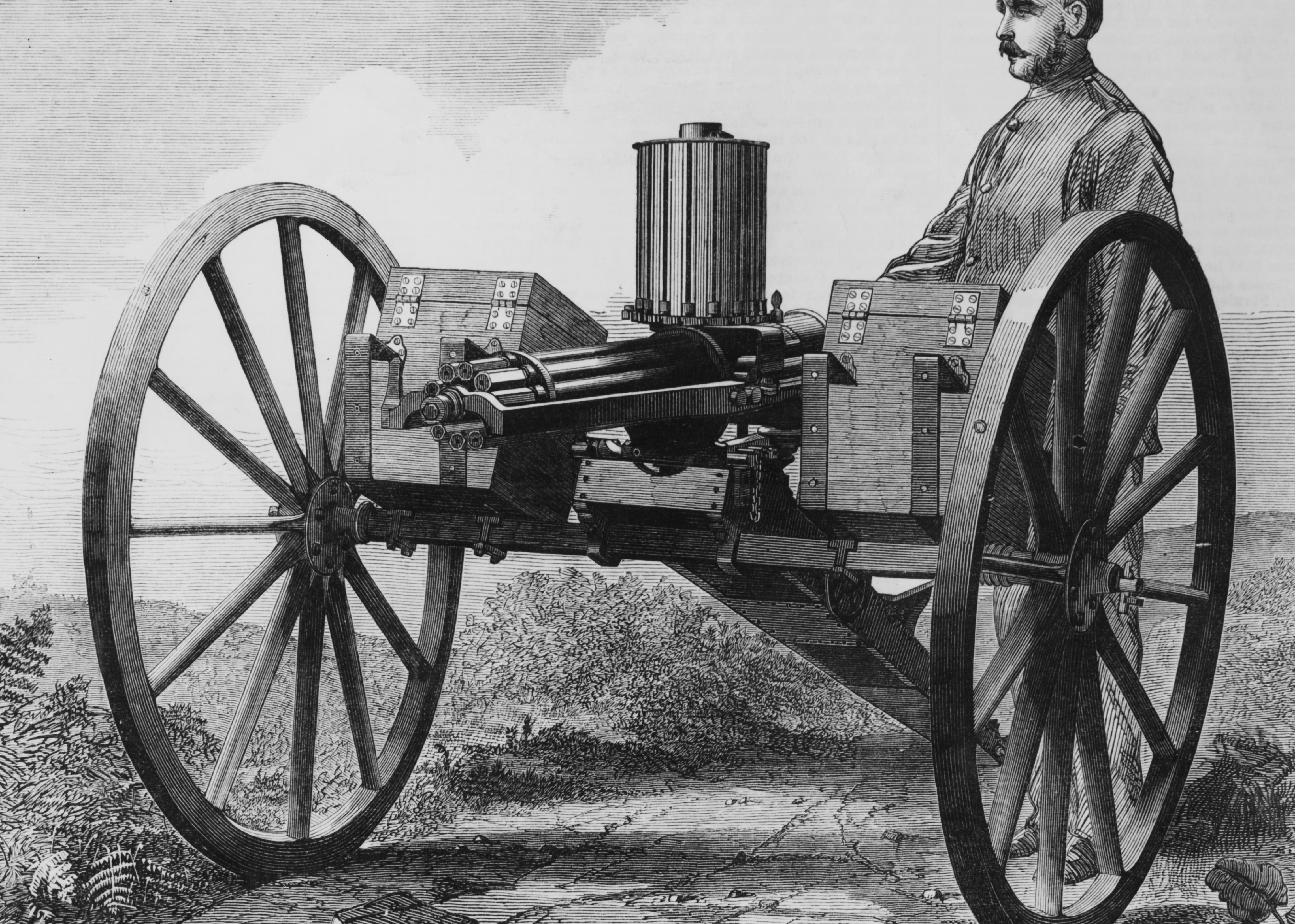 In the early 1860s, Richard Gatling invented the first manually operated machine gun, the Gatling gun. The gun’s ten barrels could be fired and ejected within one rotation of the hand crank.