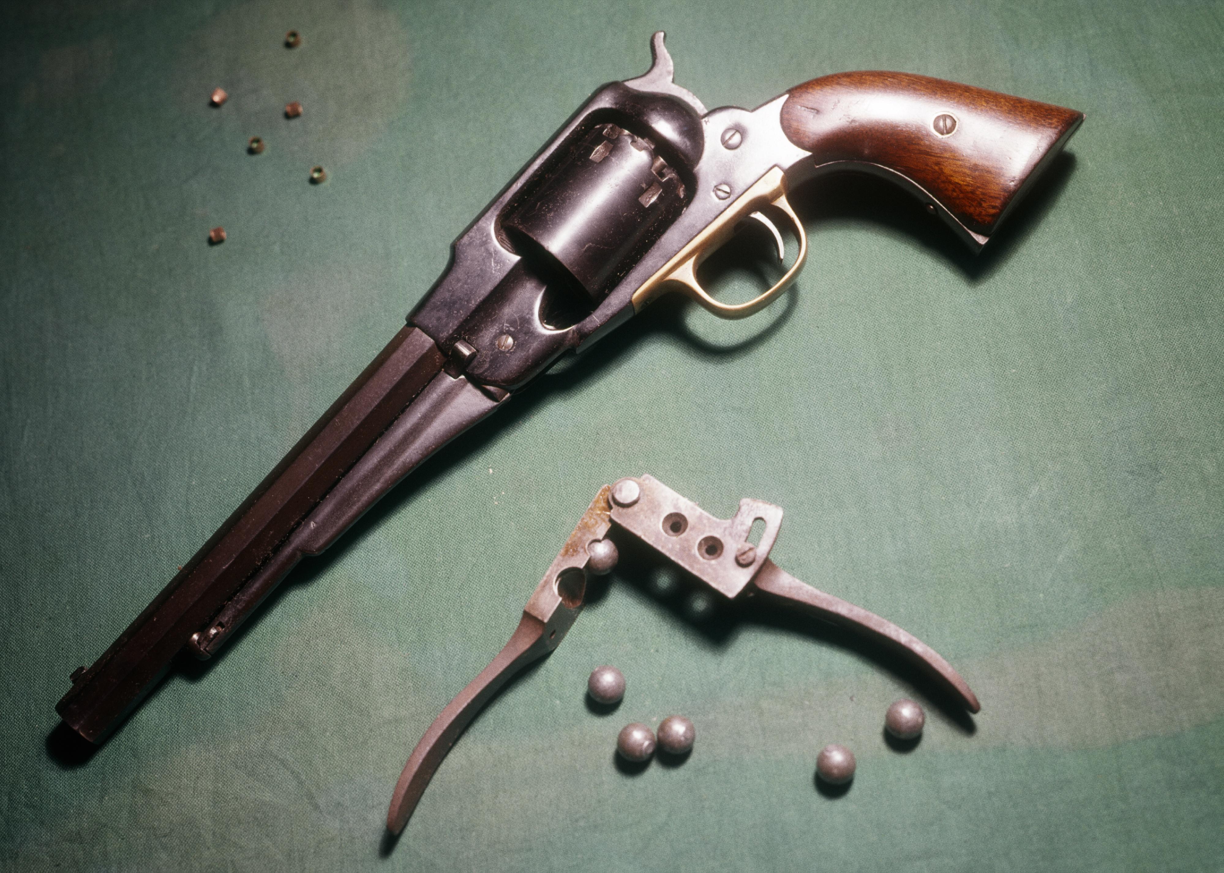 The revolver was one of the first firearm models to significantly improve upon the rate of fire. Because the handgun contains multiple chambers for cartridges, users do not need to reload after each firing. While the very first revolver mechanism is thought to have been invented sometime in the 16th century, it wasn’t until 1836—when American Samuel Colt patented a more practical and cost-effective design—that the firearm took off in popularity. In his model, the cylinder is automatically rotated after firing, and empty cases are ejected once the cylinder is opened.