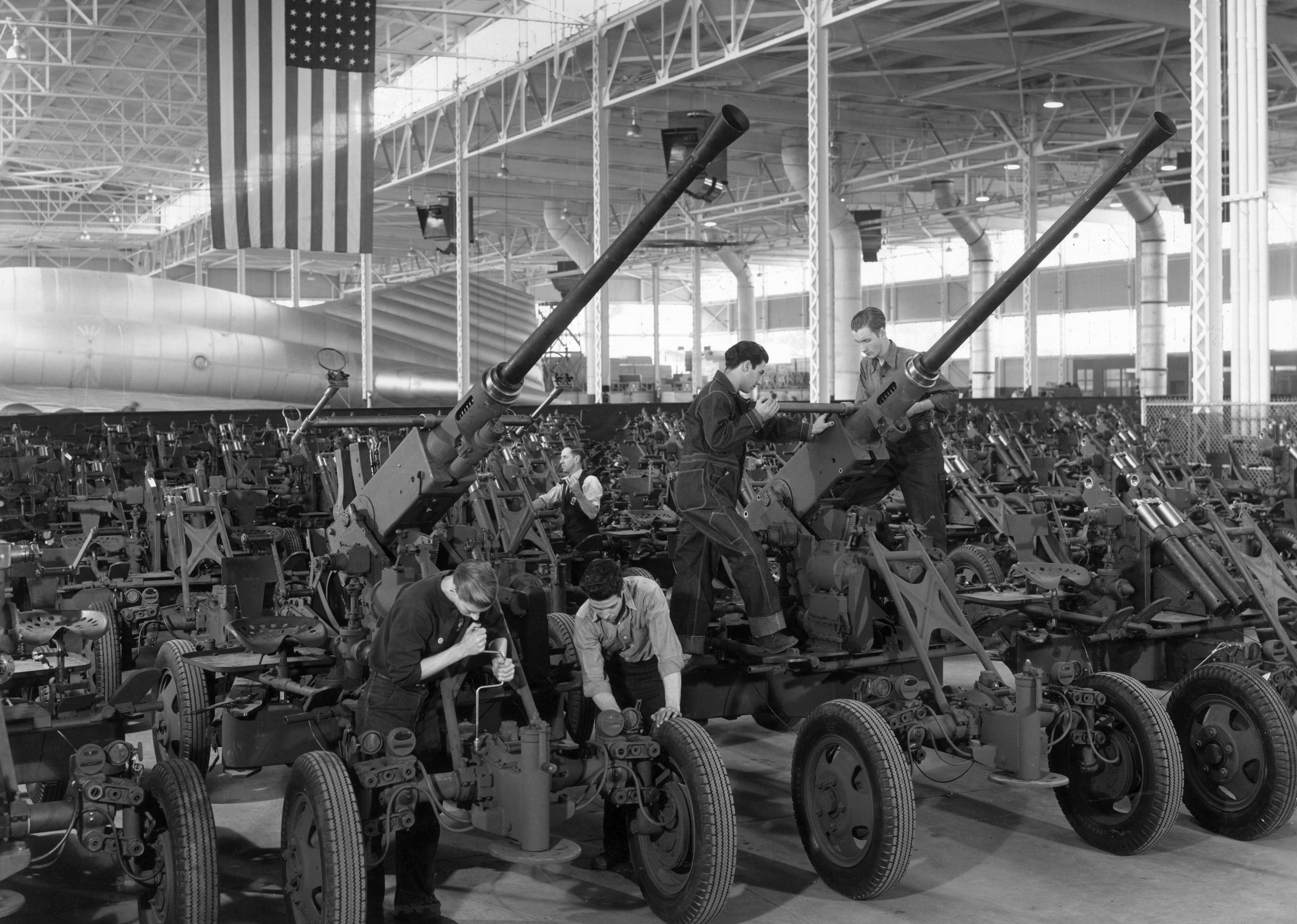 A full-length view of young male workers wearing uniforms, assembling 40 millimeter anti-aircraft guns.