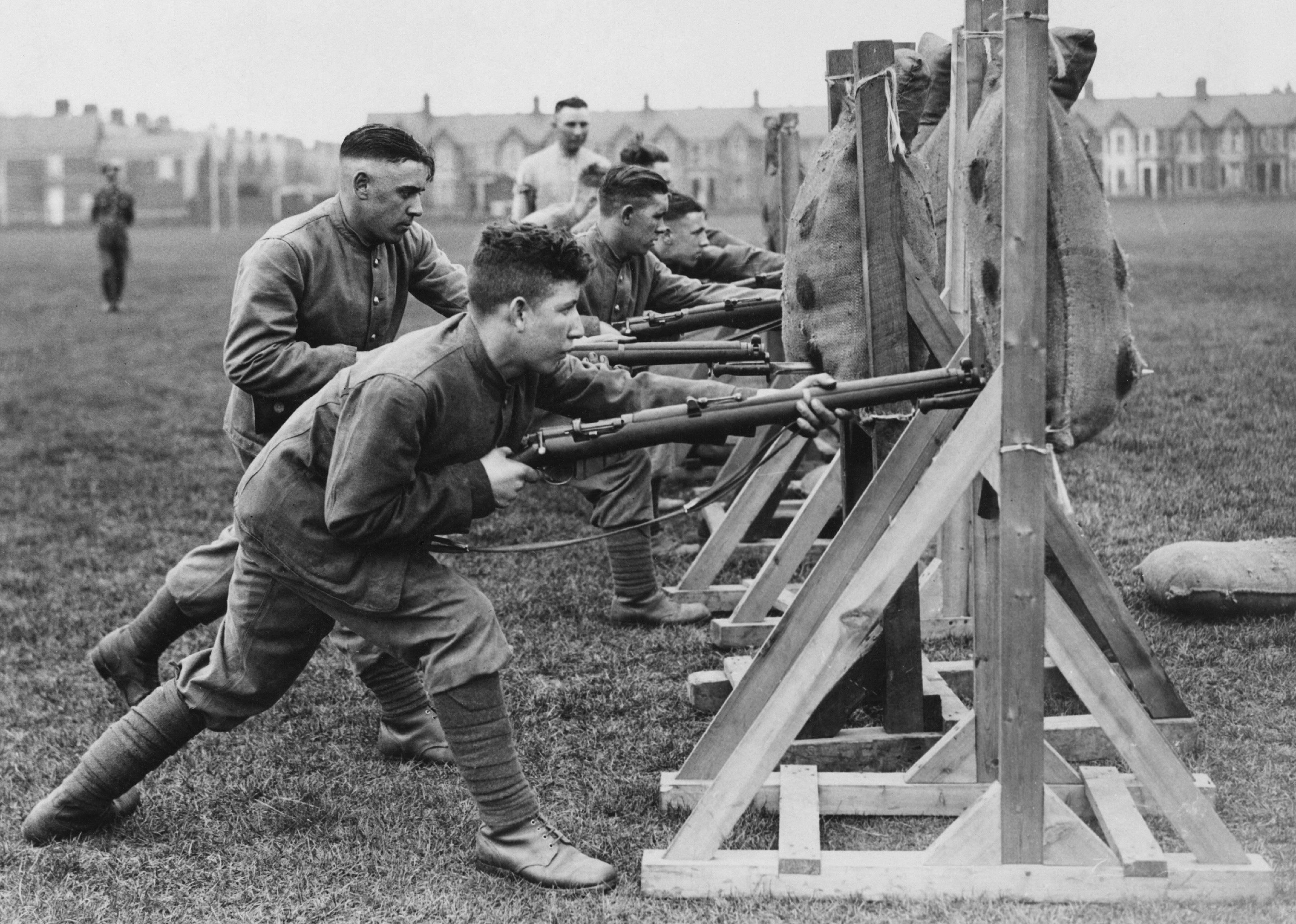 Soldiers undertake bayonet thrust practice against straw filled dummies using a bolt action rifle.