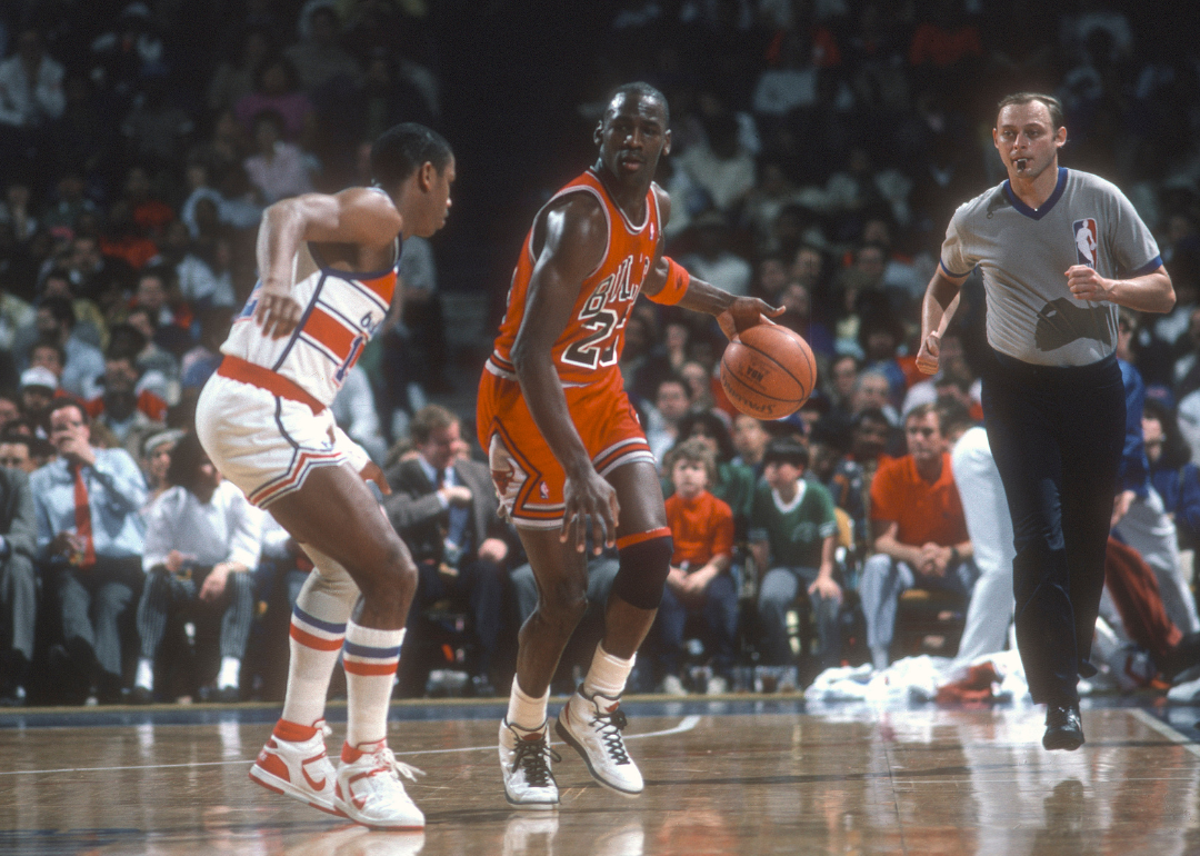 Michael Jordan dribbles the ball up court in a 1986 game.
