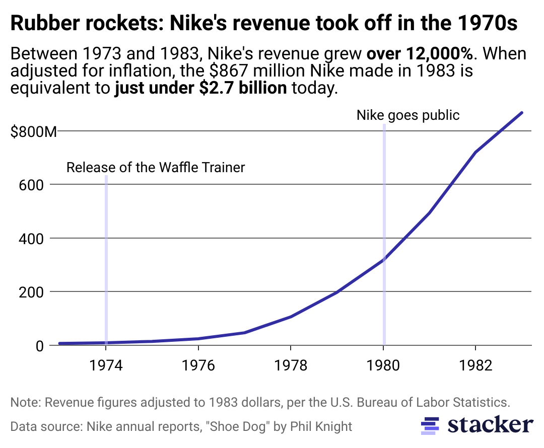 Line chart showing Nike’s revenue growth during the 1970s-80s.