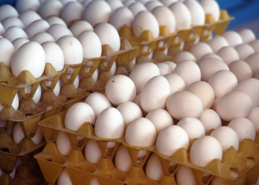 Stacks of white eggs in crates.