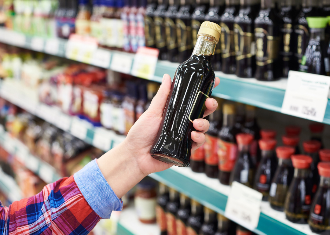 A person holding a bottle of soy sauce in the store.