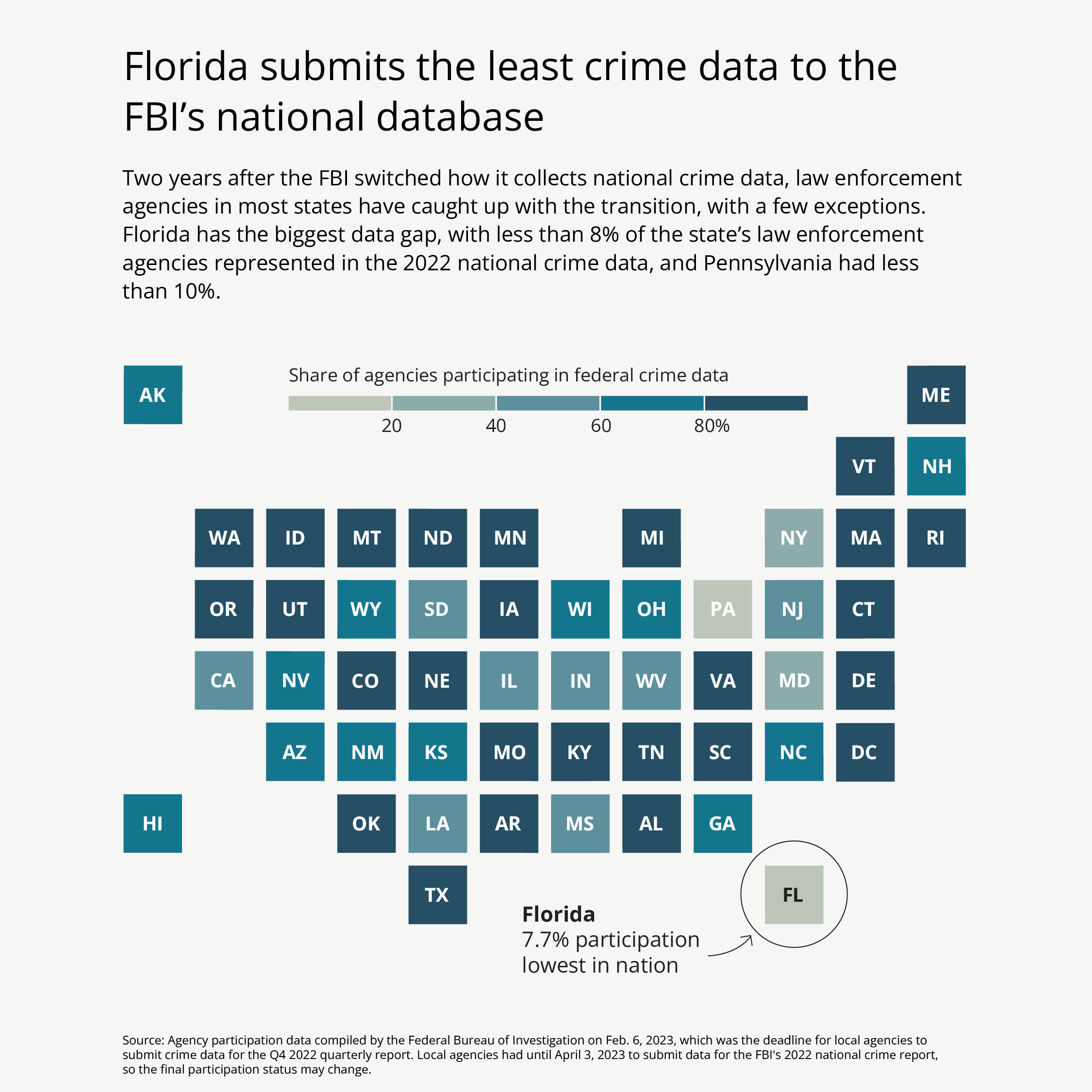 While the FBI’s new crime data system will eventually enable criminologists and police makers to analyze crime trends in greater detail, Florida’s low participation at both the national and state level makes it an outlier. States like California that have been slow with the transition to the new system have reached over 50% adoption.