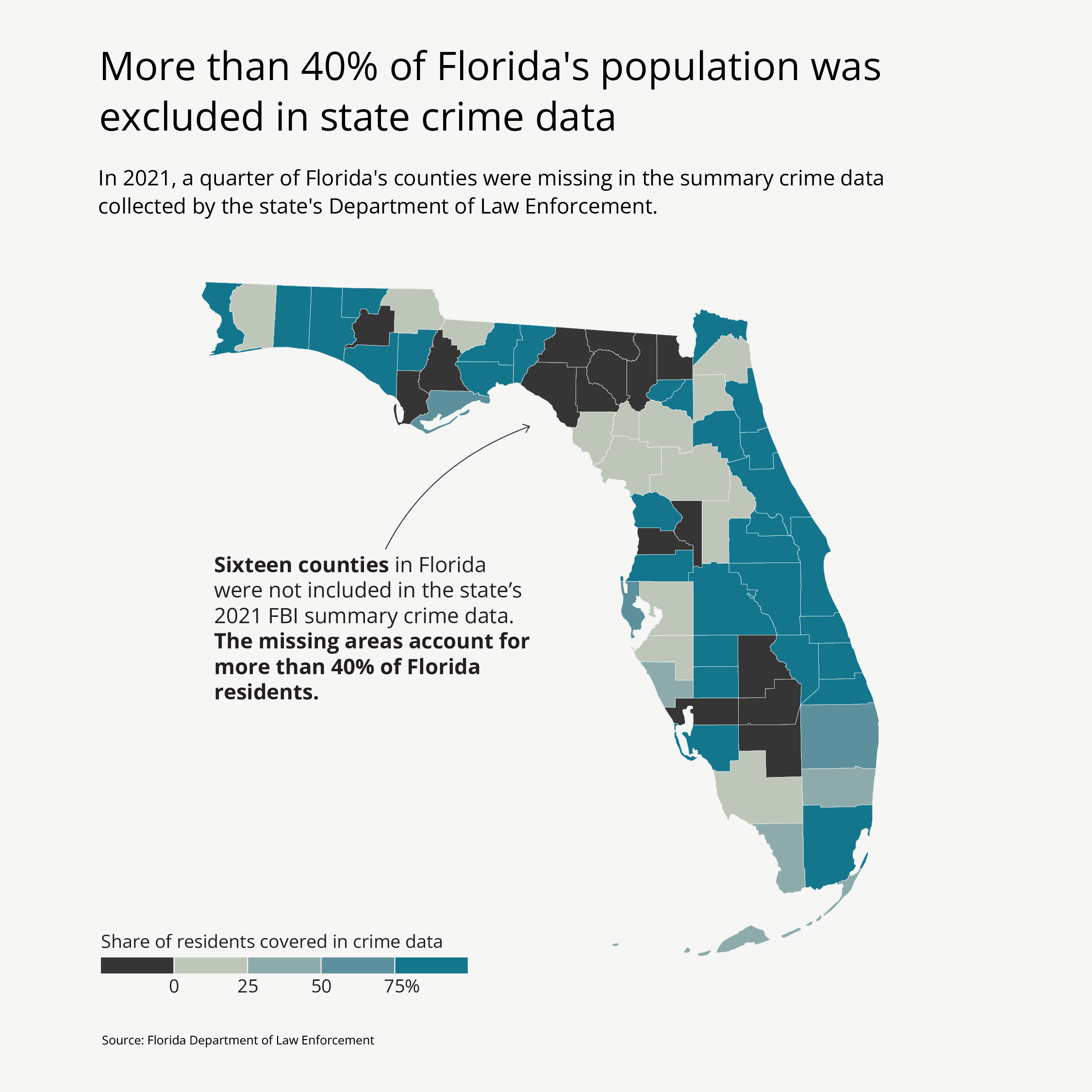 A map of Florida shows 40% of the state’s residents are not accounted for in 2021 summary crime data.