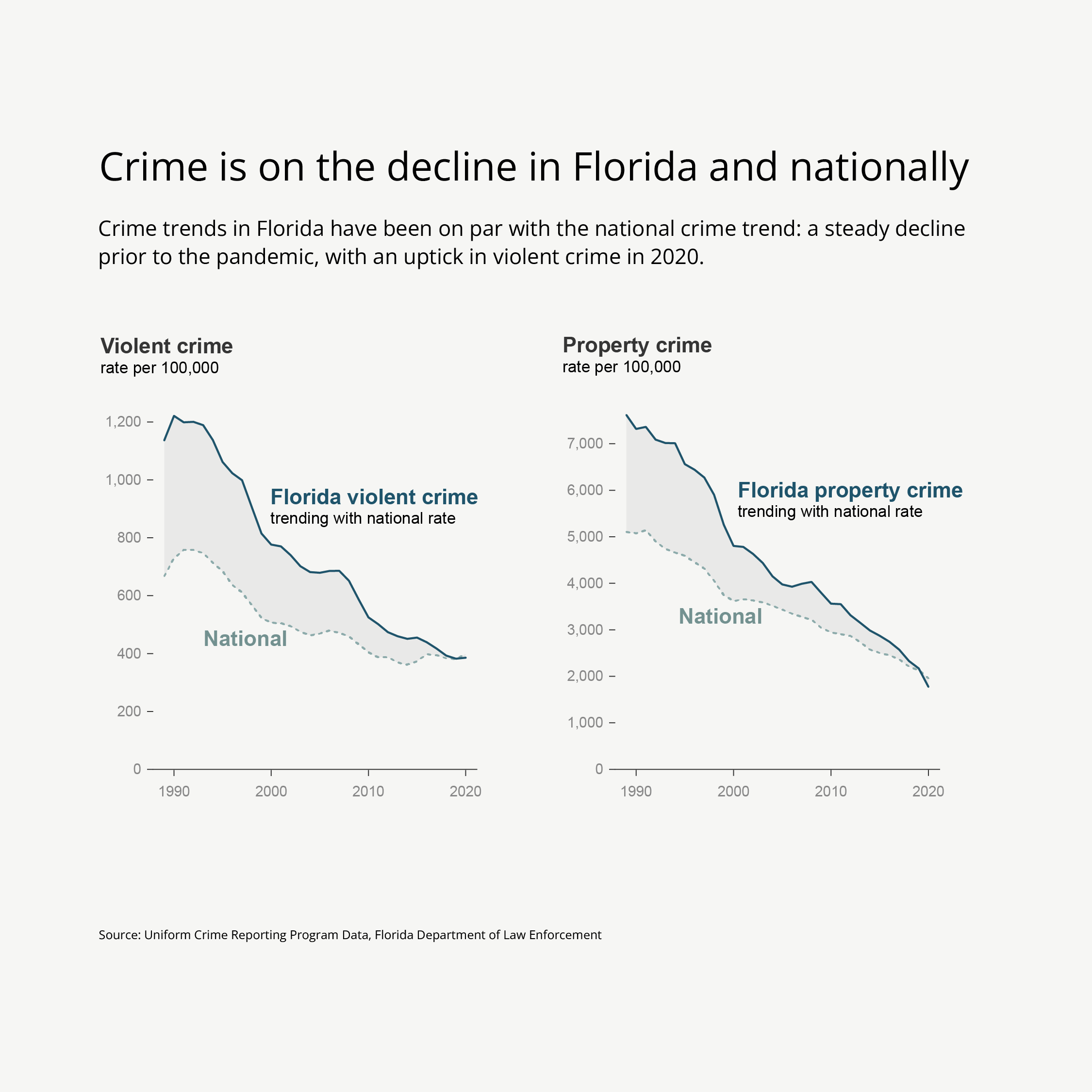 In general, Florida’s crime trends align with the national one. While experts say Florida’s current crime data cannot be compared with data from past years, DeSantis is right that the state’s overall crime rate was on a downward trend before 2021. As murders spiked in cities like New York and Chicago during the pandemic, Miami and Orlando also saw increases in murders.