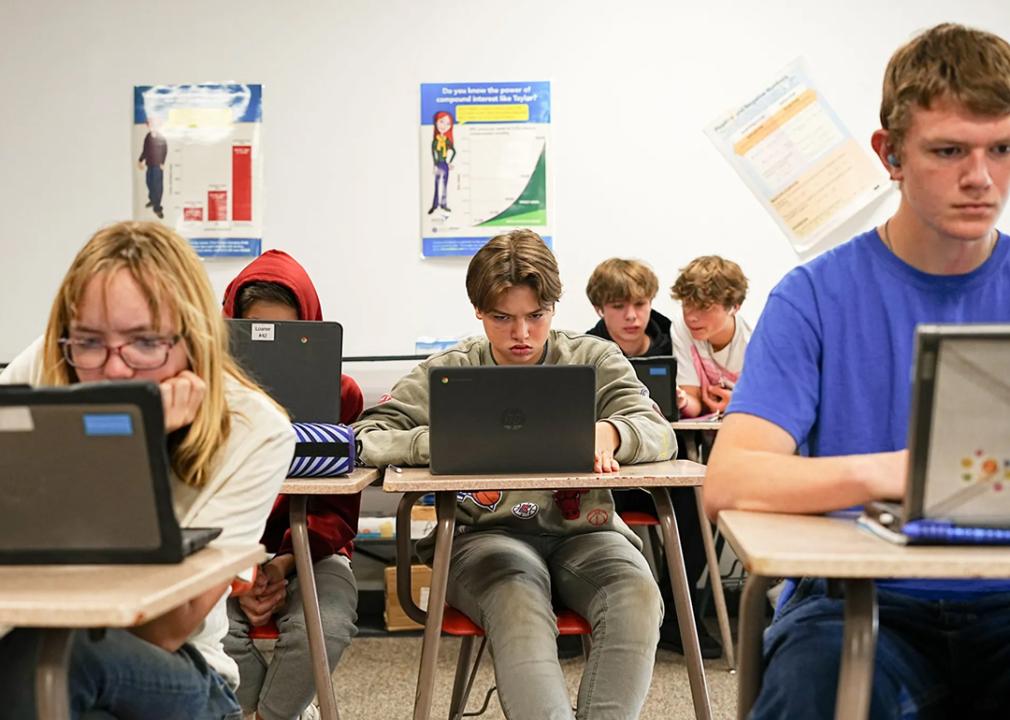 BRAHAM, Minn. — It was fourth-period Basic Algebra 8 class on a gray October morning at Braham Area High School. Teacher Rick Riccio had assigned an exercise on converting large integers to scientific notation, but fifteen minutes in, some students had lost focus. Two girls at a back table sang, their worksheets empty. Two boys pulled up games on their laptops, as two other girls discussed what they’d name their children someday. Â