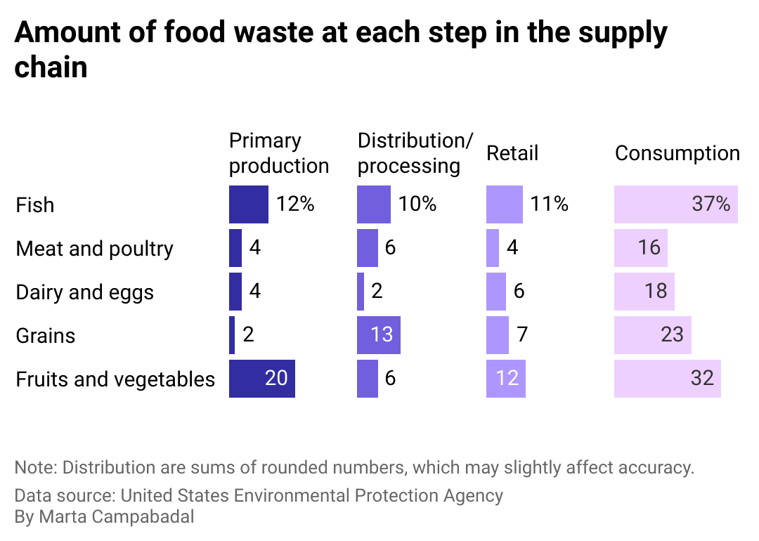 Split bar showing the percent of available food estimated to be lost or wasted by food category and food supply chain stage.