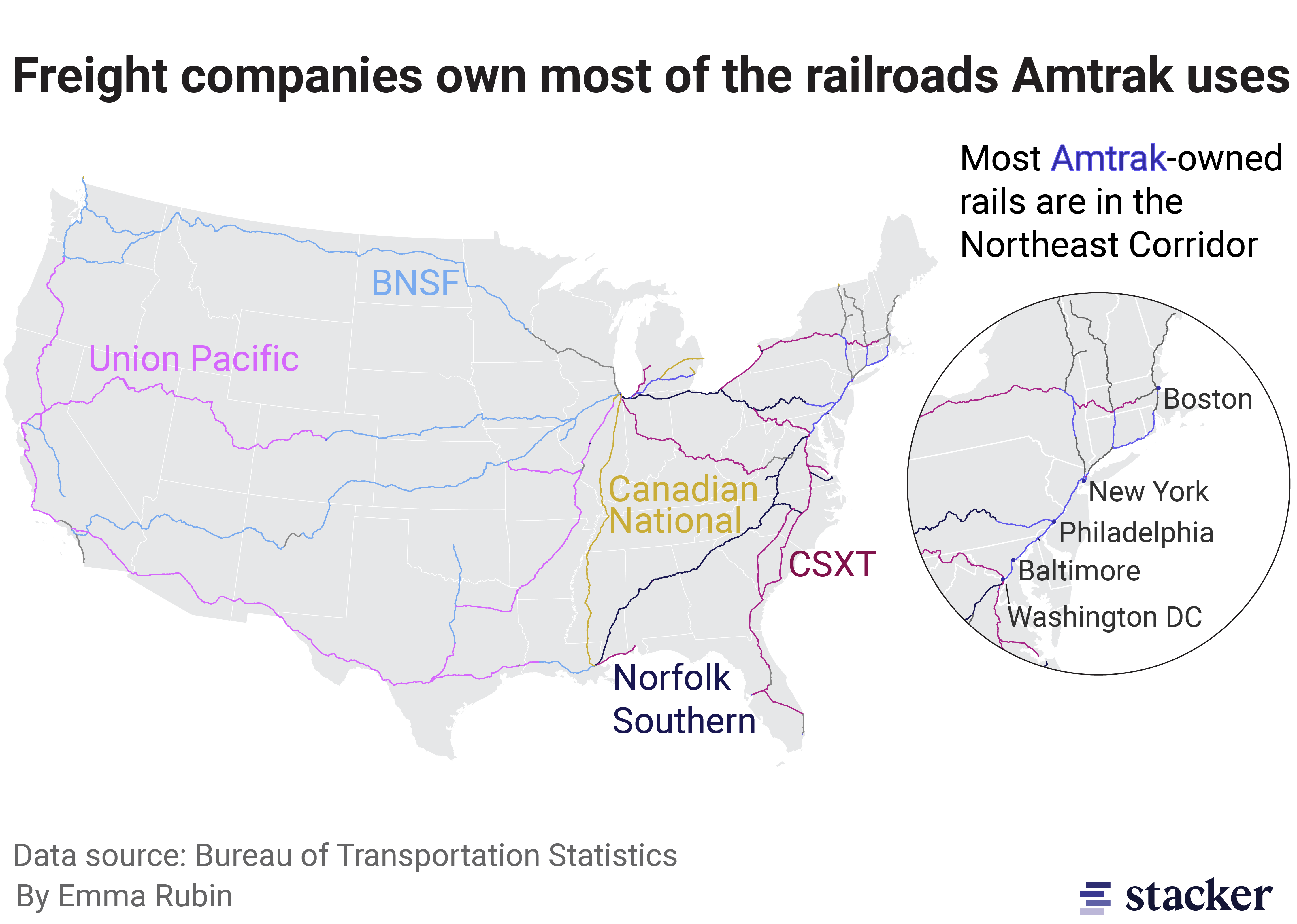 Map of Amtrak routes color coded by rail ownership. Amtrak does not own the majority of the rail it uses.