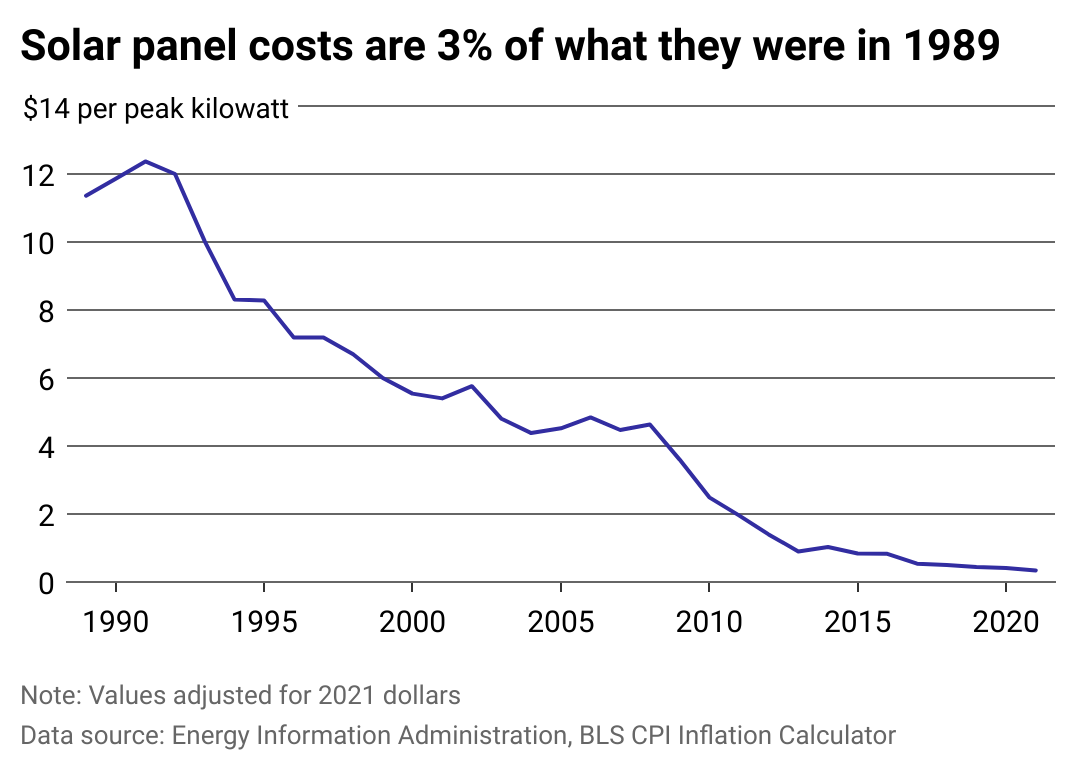 Line chart of the falling cost of solar panels since 1989, now at $0.34