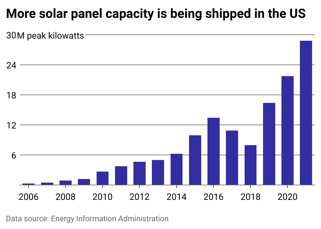 Solar panels shipped to the U.S., measured in electricity-generating capacity, rose to a record 28.8 million peak kilowatts in 2021, according to the EIA. This unprecedented high was achieved despite supply chain constraints and higher-than-usual material costs over the last several years.