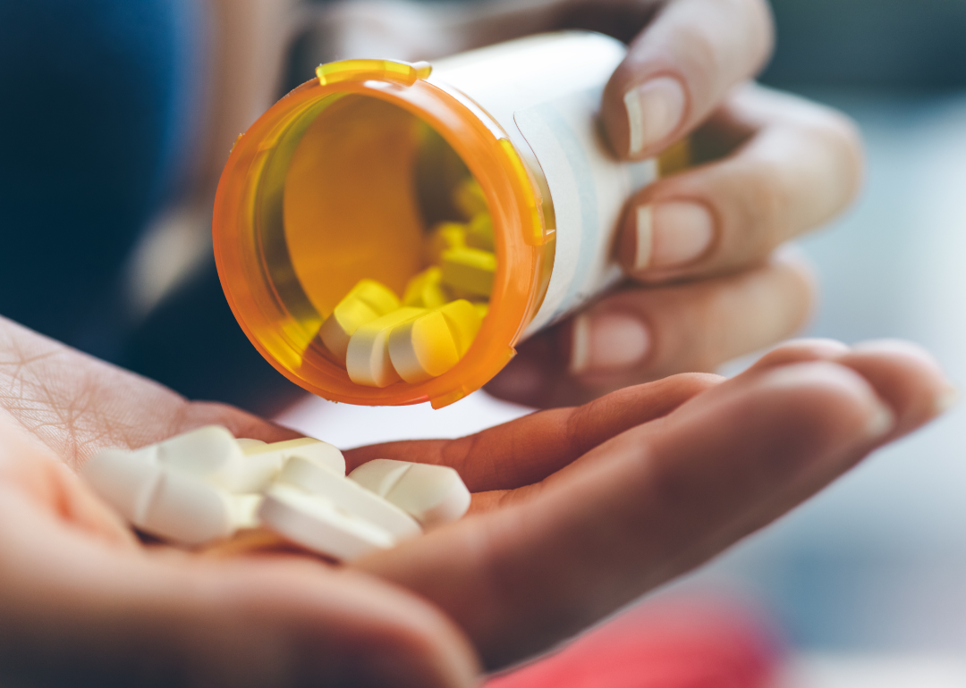 A close up of a person pouring pills from a prescription bottle into their hand.