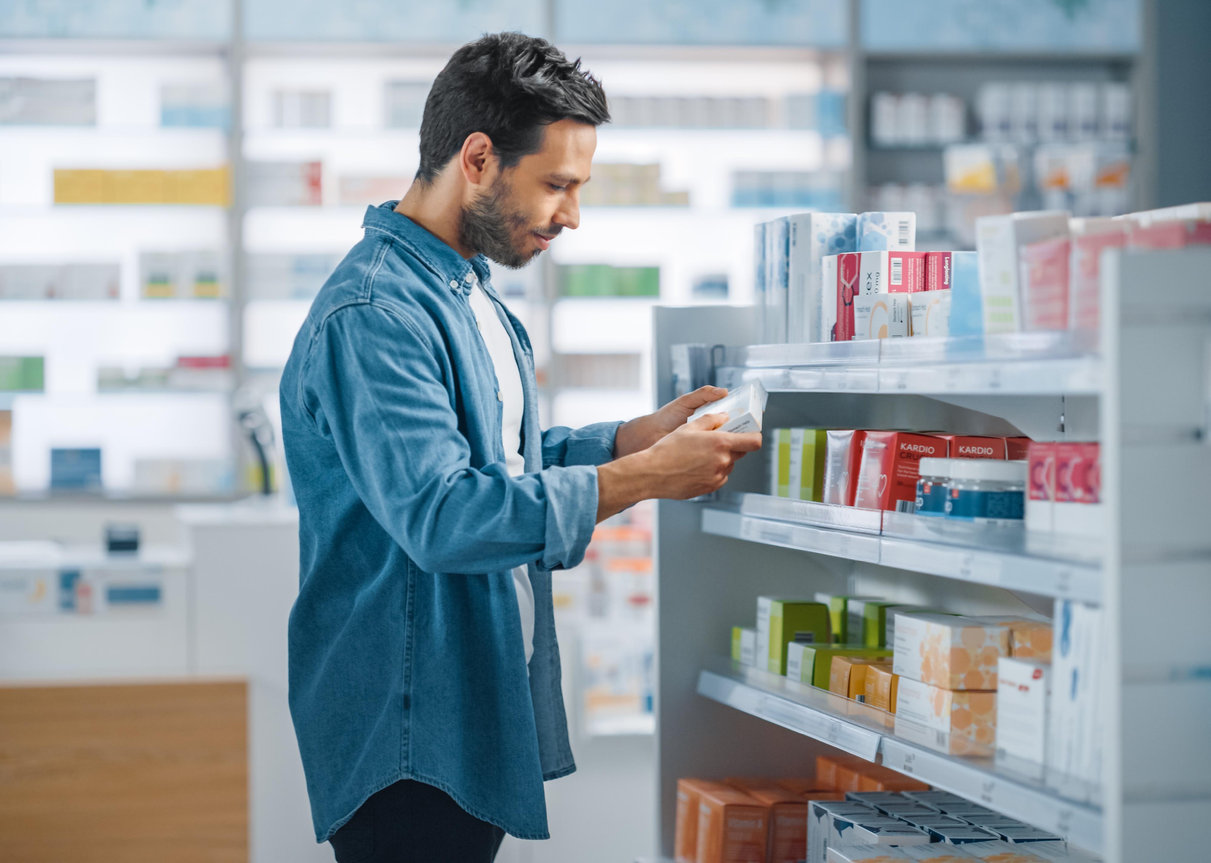 Man looking at medicines in drugstore.