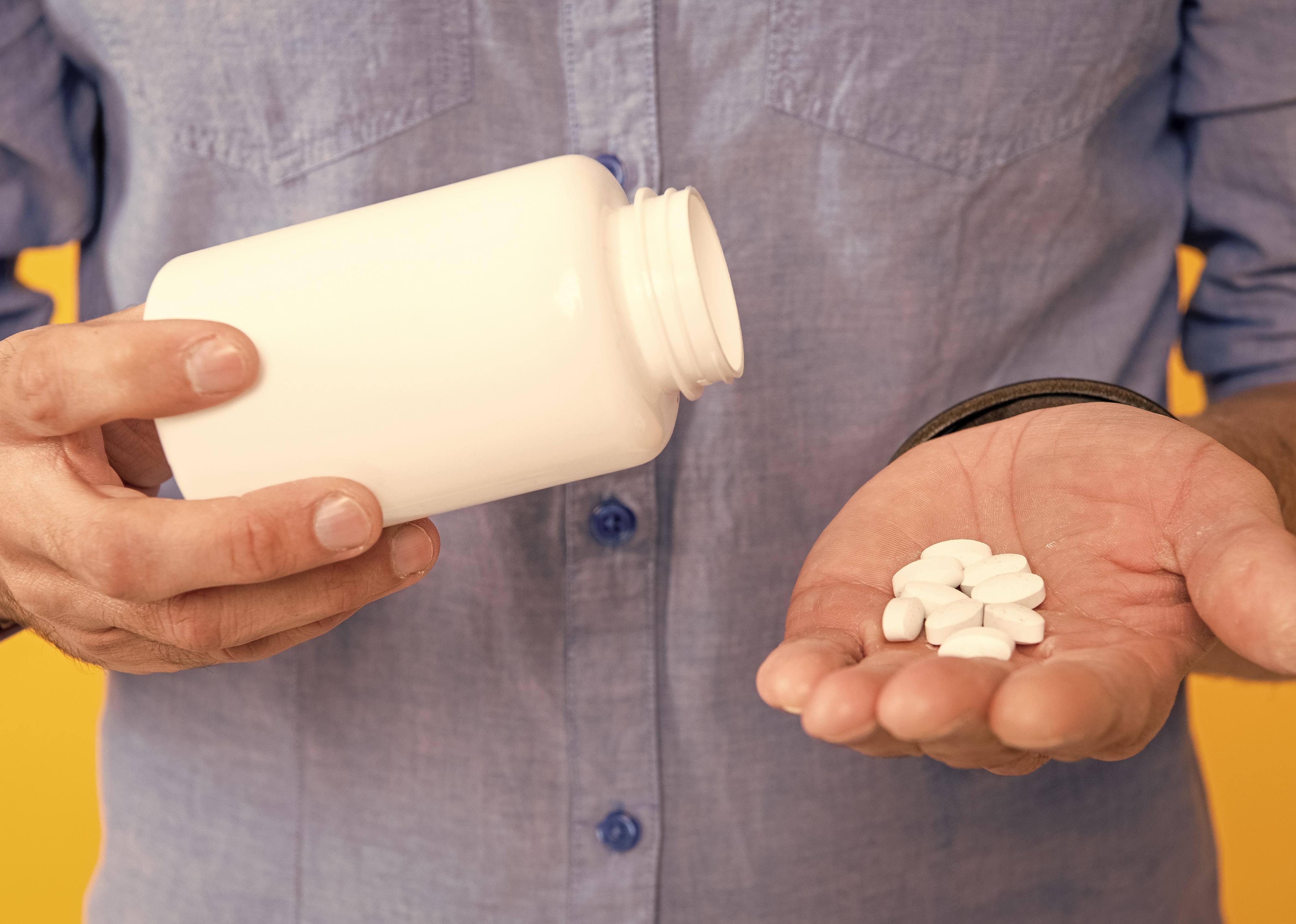 A close up of a person pouring pills from a prescription bottle into their hand.